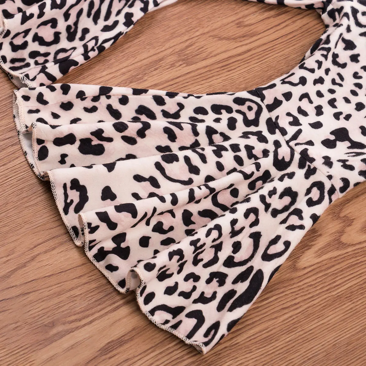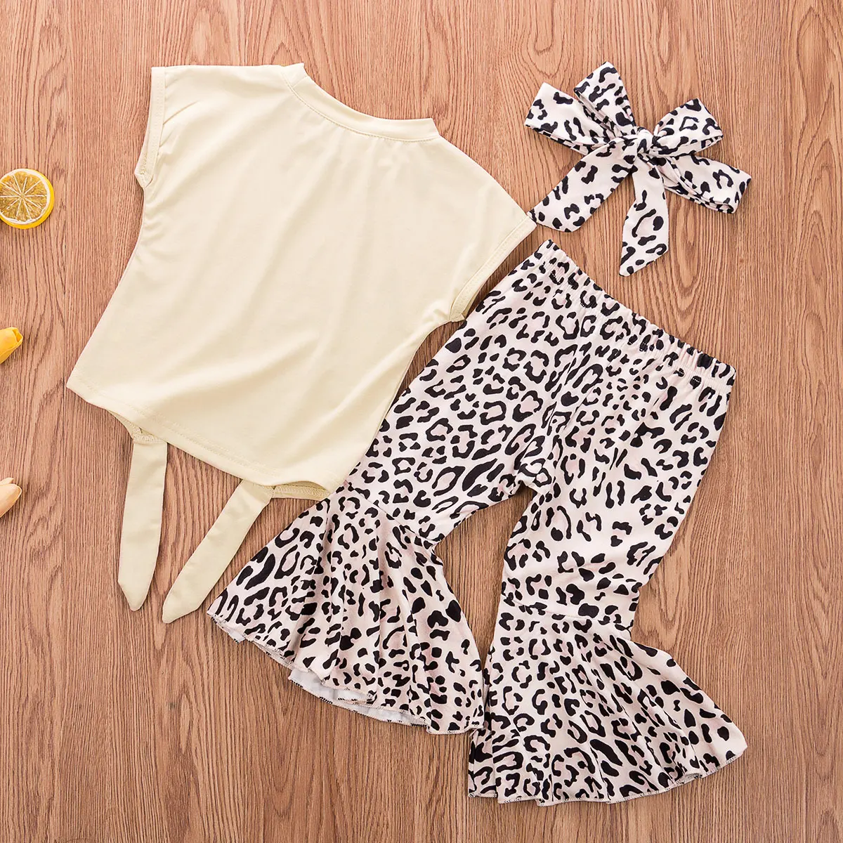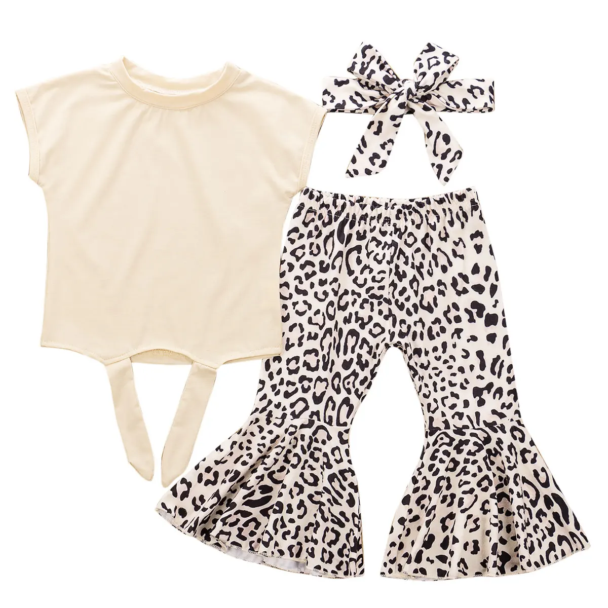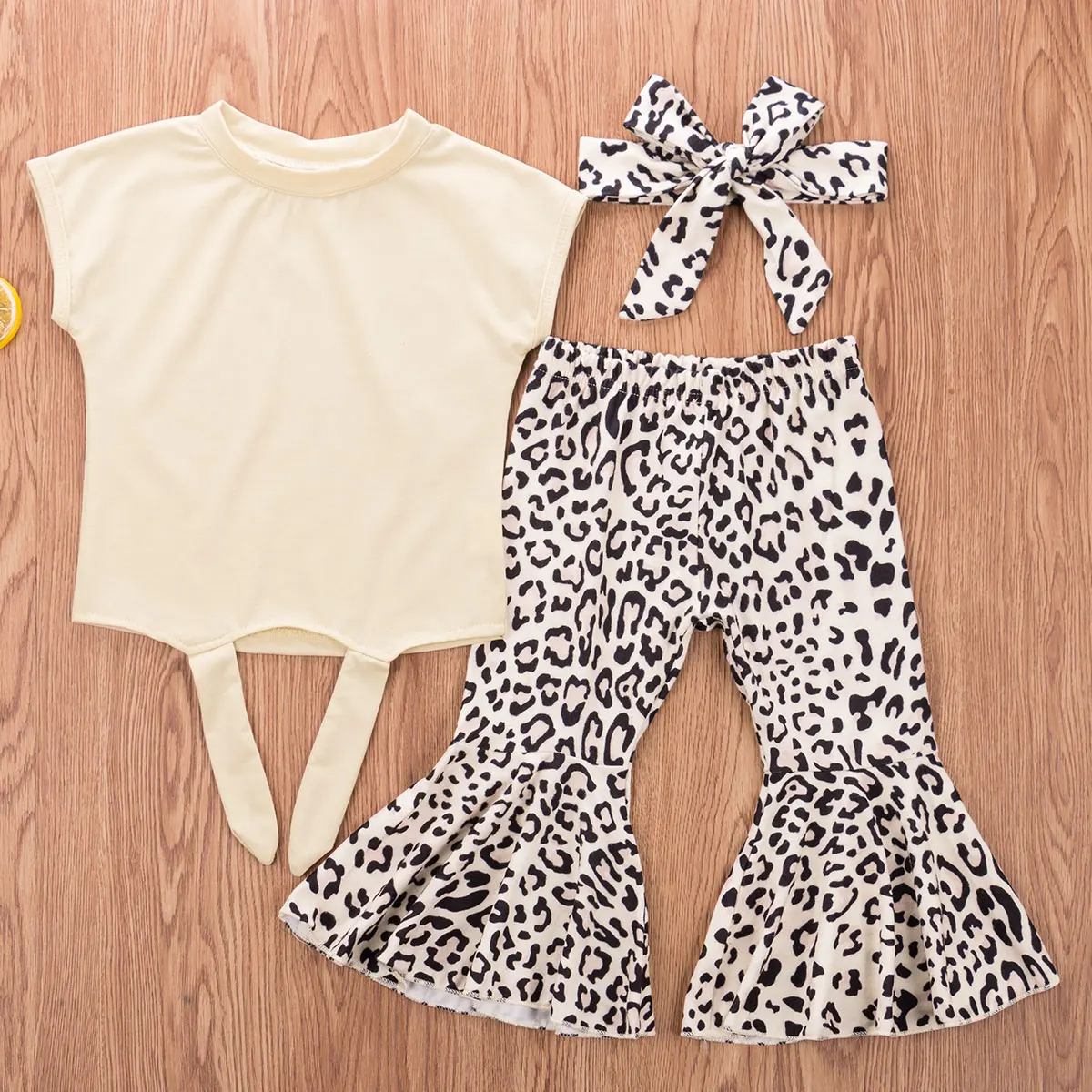 Модная Однотонная футболка с коротким рукавом + брюки-клеш с леопардовым принтом + повязка на голову