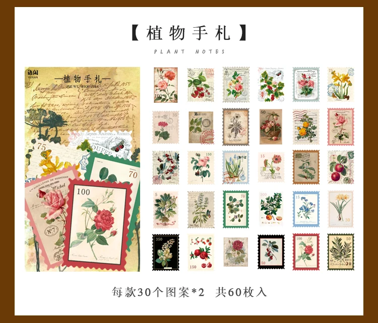 60 шт.пакет, винтажные антикварные наклейки с растениями, этикетки, бумажные стикеры для посылка стоятельного оформления дневника, альбома, скрапбукинга