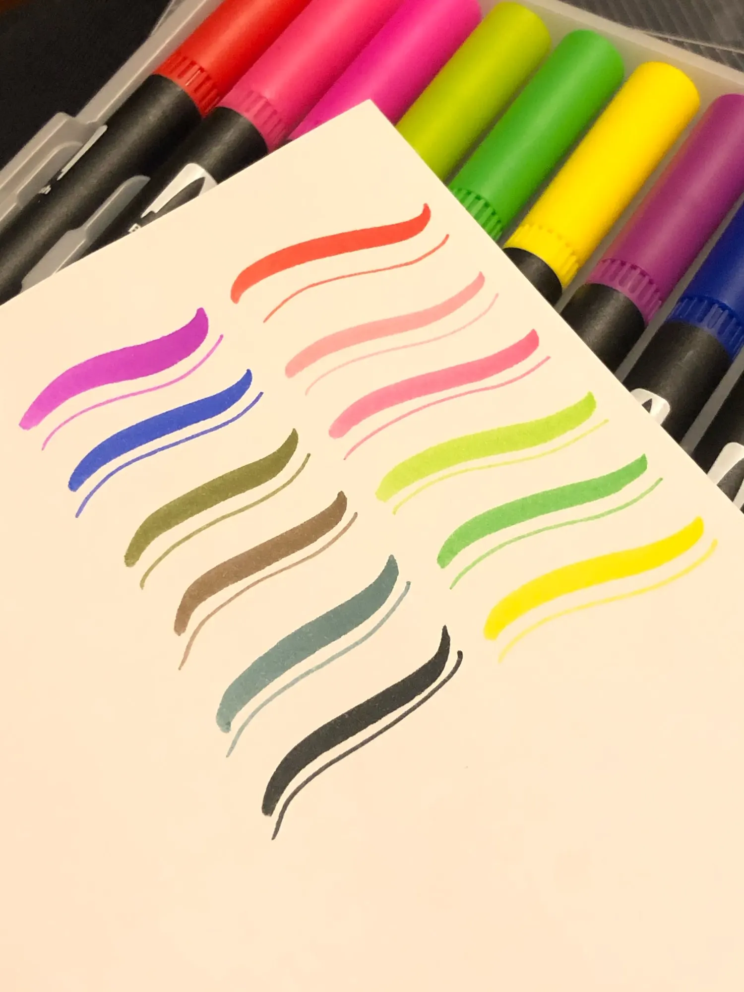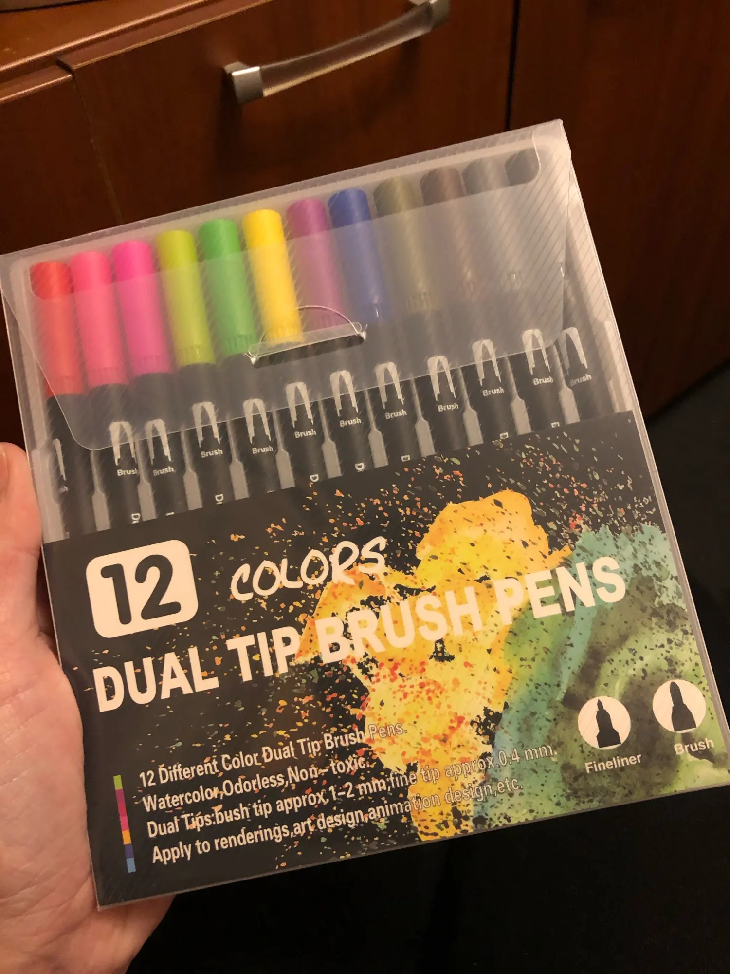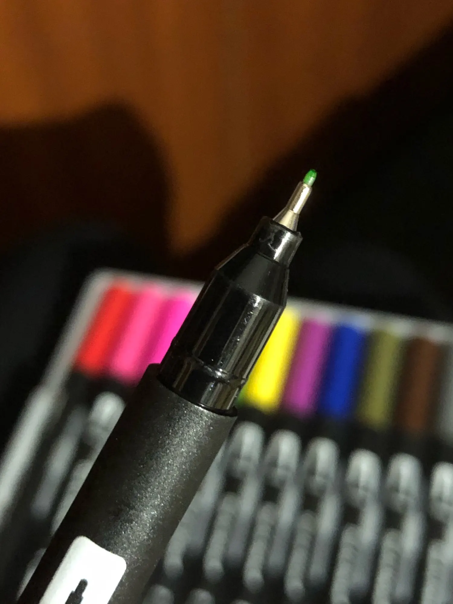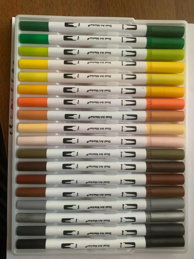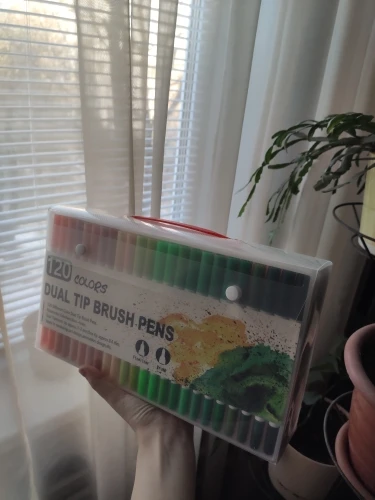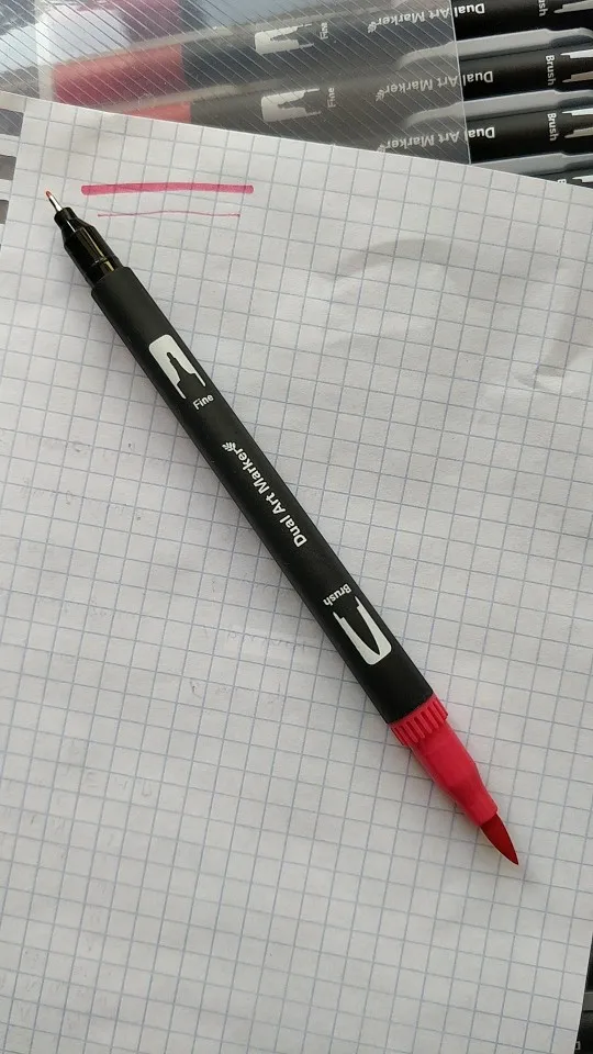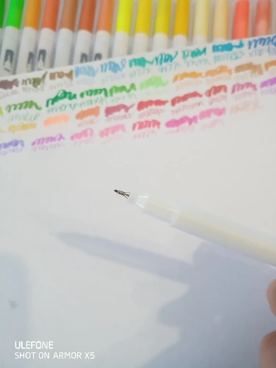 Фломастеры классные, но обратите внимание, кончик-кисточка не очень гибкая. Гнется мягко примерно до одной трети. Выше довольно жеская, но все равно гнется и может давать мазок от очень тонкой до жирной линии. Просто бывают маркеры где кончик прям очень гибкий. Как у меня на фото штрихи пришлось делать немного боком. В остальном покупкой очень довольна. Доставка была из РФ, потому до Калуги дошло всего за пять дней