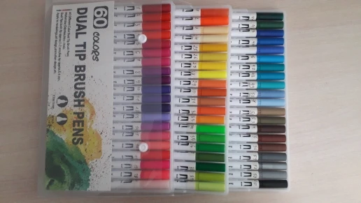 Доставка в Москву с 12.11-19.11 курьером домой. Отличные. Все 60 шт хорошо пишут. Беру второй набор. Первый раз взяла на пробу 12 цветов в белом корпусе-оказались отличные брашпэны и захотелось таких больше цветов) Первым почти 2 года при вертикальном хранении, сочные как новые, кисти в первозданном виде. От первых в восторге. Чувство что тот набор другой, там колпачок закрывается с щелчком, тут без щелчка и на некоторых слабо держится. В целом так же довольна, но на 4. Колпачок не всегда соответствует цвету. На распродаже взяла за 830. Больше не стоят. Кисть фетровая. Некоторые кисти более мягкие, некоторые более жесткие-такими и остаются, мягче не становятся. Рада что выбрала именно 60 цветов, а не больше, есть очень близкие оттенки, но есть и необычные. На практике не просвечивают, чаще использую светлые оттенки-в тетради для пометок, на более плотных листах в блокнотах, раскраска у меня одна-там вообще не просвечивают. Лист для записей на фото. Для каллиграфии побаловаться годится