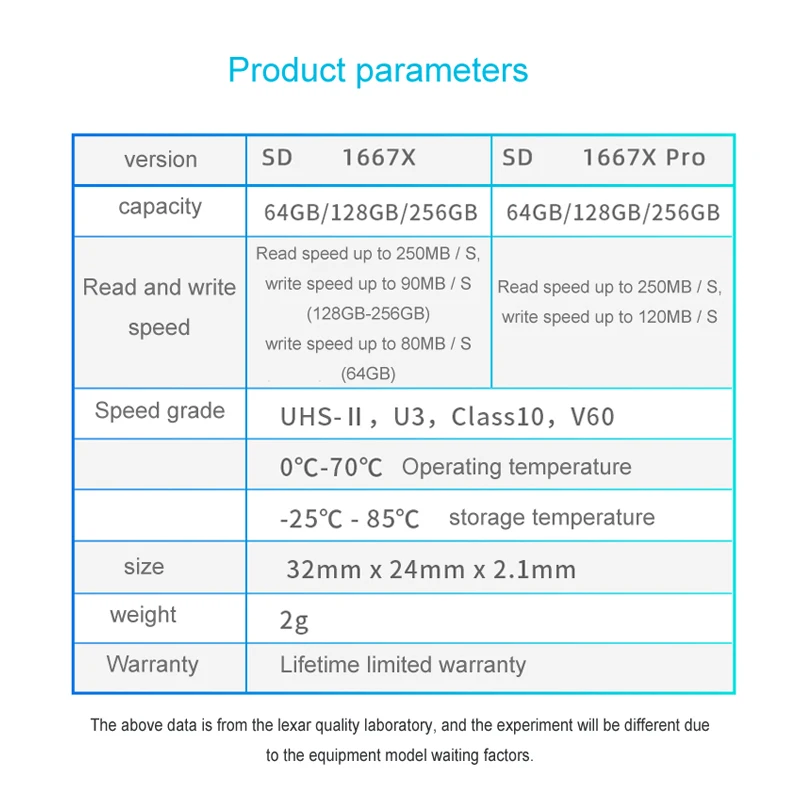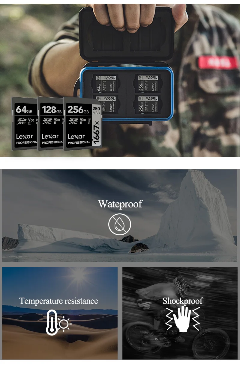 Lexar®Профессиональный 1667x SDXC™UHS-II карты позволяют быстро захвата и передачи качественные фотографии, в том числе 1080p Full-HD, 3D и видео в формате 4K с скорости чтения до 250 МБ/с. (1667x)1. Эта карта использует технологию UHS-II (UHS Speed Class 3 (U3) для высокоскоростной производительности. Это значительно ускоряет рабочий процесс от начала до конца. Особенности Высокоскоростной производительности использует UHS-II технологии (U3) для записи файла скорость передачи данных до 250 МБ/с. (1667x/США)-1 шт. Захватывает изображения высокого качества и удлиняет Потрясающие 1080p Full-HD, 3D и 4K видео DSLR камеры, кинокачественные видеокамеры или 3D камеры Большие возможности до 256 ГБ позволяют вам наслаждаться съемкой дольше, не меняя карты Высокоскоростная передача файлов с карты на компьютер, чтобы значительно ускорить workflow2 Обратная совместимость с UHS-I устройствами Ограниченная пожизненная Гарантия 1 до 250 МБ/с. передачи, скорость записи ниже. Скорости, основанные на внутреннем тестировании. Фактическая производительность может отличаться. x = 150 КБ/с. 2 самых высоких скорости передачи достигаются только в сочетании с SD UHS-II reader Внешний вид продукта, производительность, предложения программного обеспечения и упаковка могут варьироваться в зависимости от даты доставки и наличия запасов. Фактический объем памяти может отличаться. 1 ГБ равен 1 миллиарду байт. Ограниченная пожизненная гарантия ограничена 10 годами от покупки в Германии и регионах, не признающих пожизненную гарантию. Lexar не несет ответственности за потерю данных или изображений.