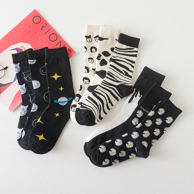 Носки унисекс, с принтом кота, коровы, зебры, смайликов, маргариток, звезд, нейтральные, жаккардовые хлопчатобумажные носки