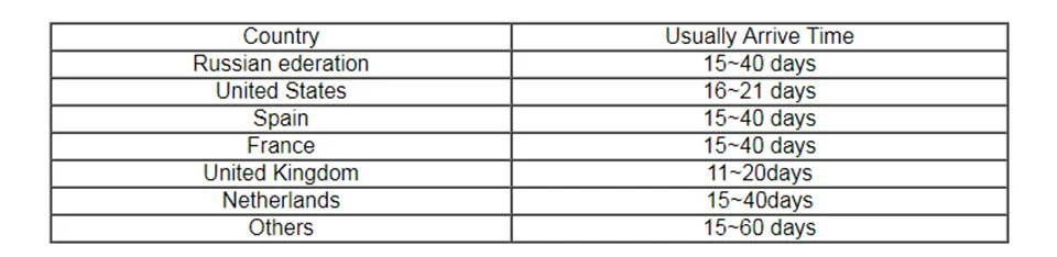 Мы используем EMS /AliExpress Стандартная доставка/Почта Китая авиапочтой/CPAM/Fedex в соответствии с вашим местоположением, и вы получите номер отслеживания в течение 1-5 дней после доставки.Мы делаем это в сотрудничестве с крупными поставщиками логистики, такими как Singapore Post, Correos, Posti Finland, SPSR, DHL и другими. Если вам нужно, пожалуйста, свяжитесь с нами, чтобы выбрать.