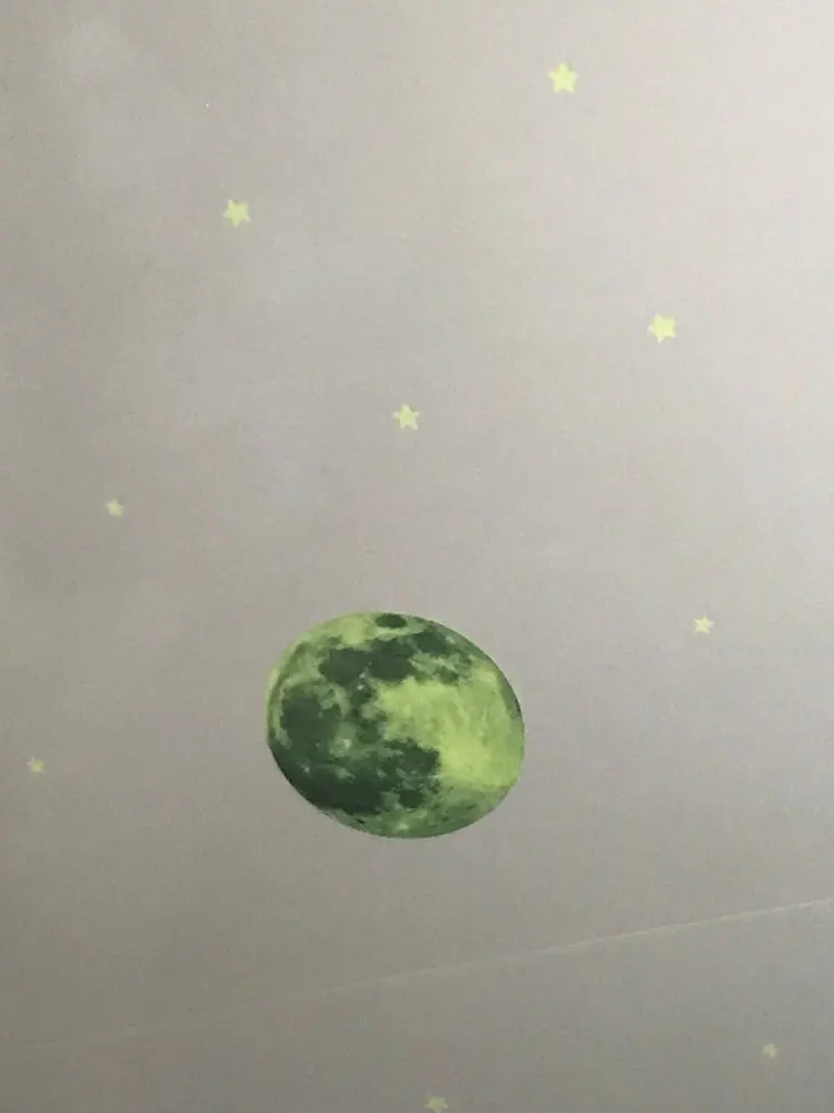 Наклейки пришли целые, были свёрнуты в рулоны вокруг пенопласта. На луне образовались складки, но клеила от середины, и все выровнялось. Около недели держала их на подоконнике, чтобы «зарядились». Первую ночь светились так ярко, что в комнате светлее стало. Жаль, фото не передает всю красоту, дочка говорит, как в сказке :-)