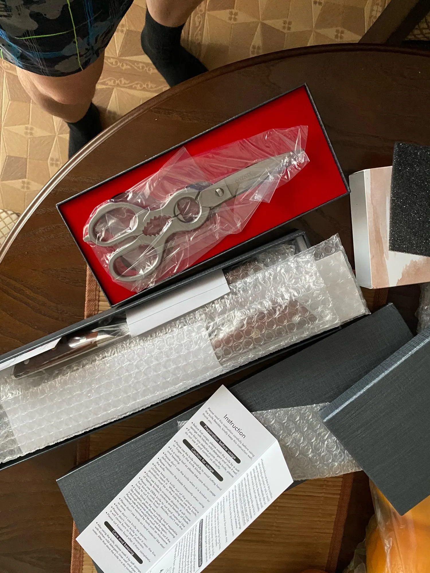 Прекрасный набор кухонных ножей! Очень довольны покупкой. Товар доставлен за 1.5 месяца в Москву. Приятно удивил подарок продавца в виде многофункциональных кухонных ножниц.