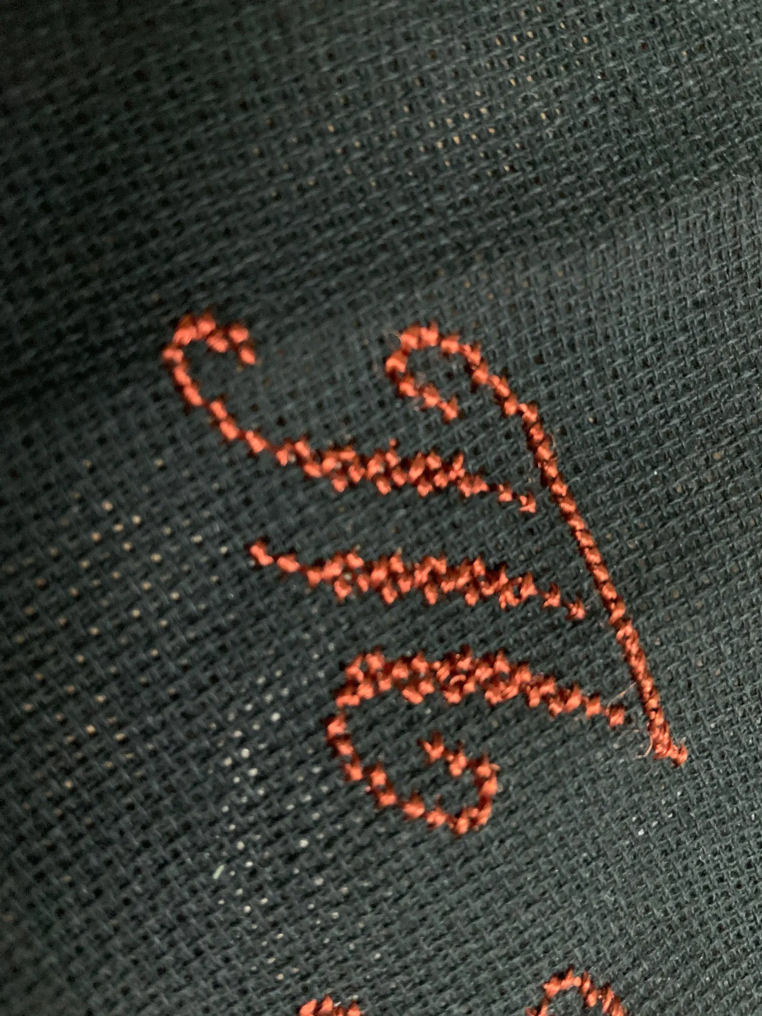 Половина стежка-наполовину крестиком, полная строчка-полным стежком.