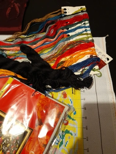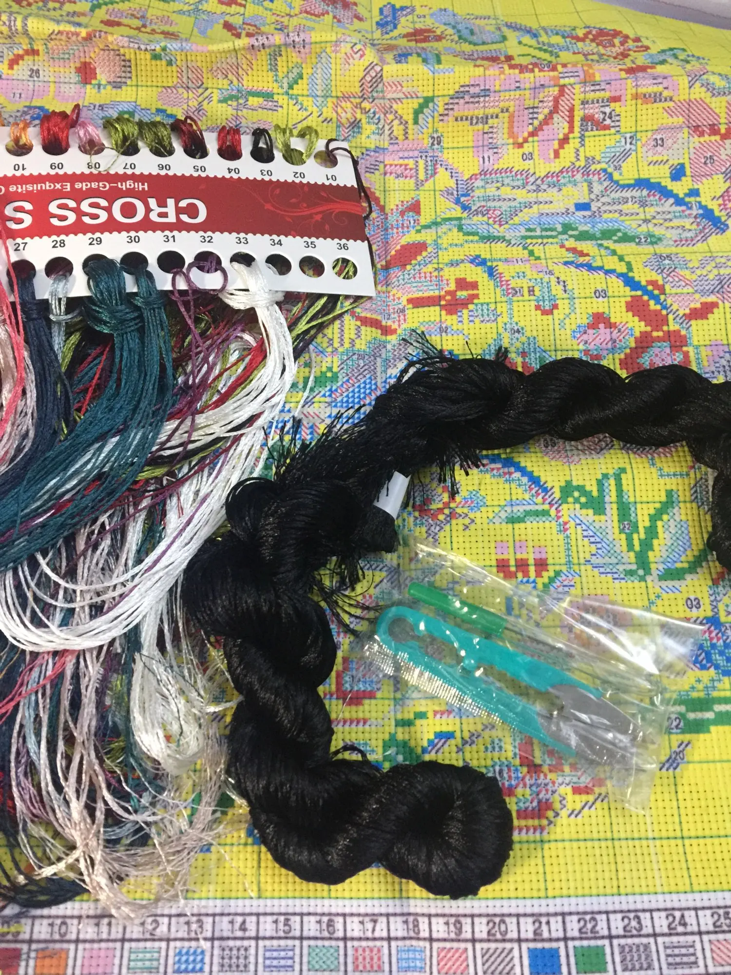 Отличное качество самой вышивки и ниток. Пока не довышивала, про количество сказать не могу, но на вид прилично так. Иголки плохого качества, уже три сломались в руках. Но привезли аж 5. Плюс всевозможные штуки для вышивания тоже положили.