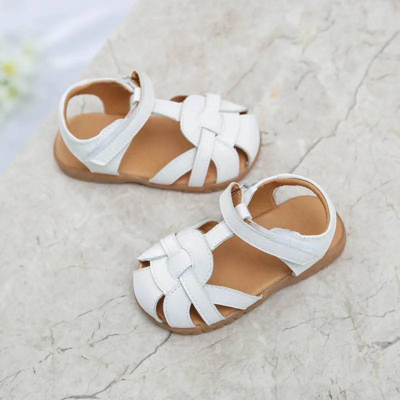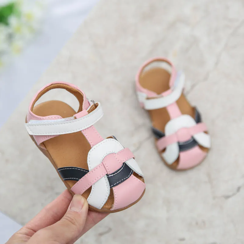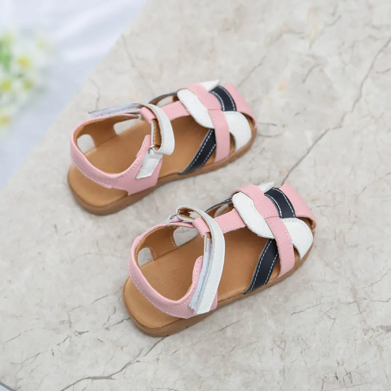 Сандалии для девочек из искусственной кожи с закрытым носком и Т-образным ремешком; Цвет белый, розовый; Новинка 2020 года; Детская обувь; Летняя обувь для малышей; Обувь для младенцев; Сандалии в полоску для маленьких