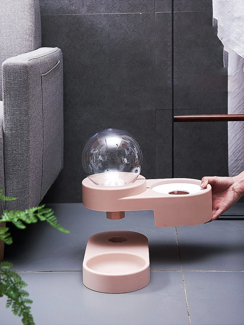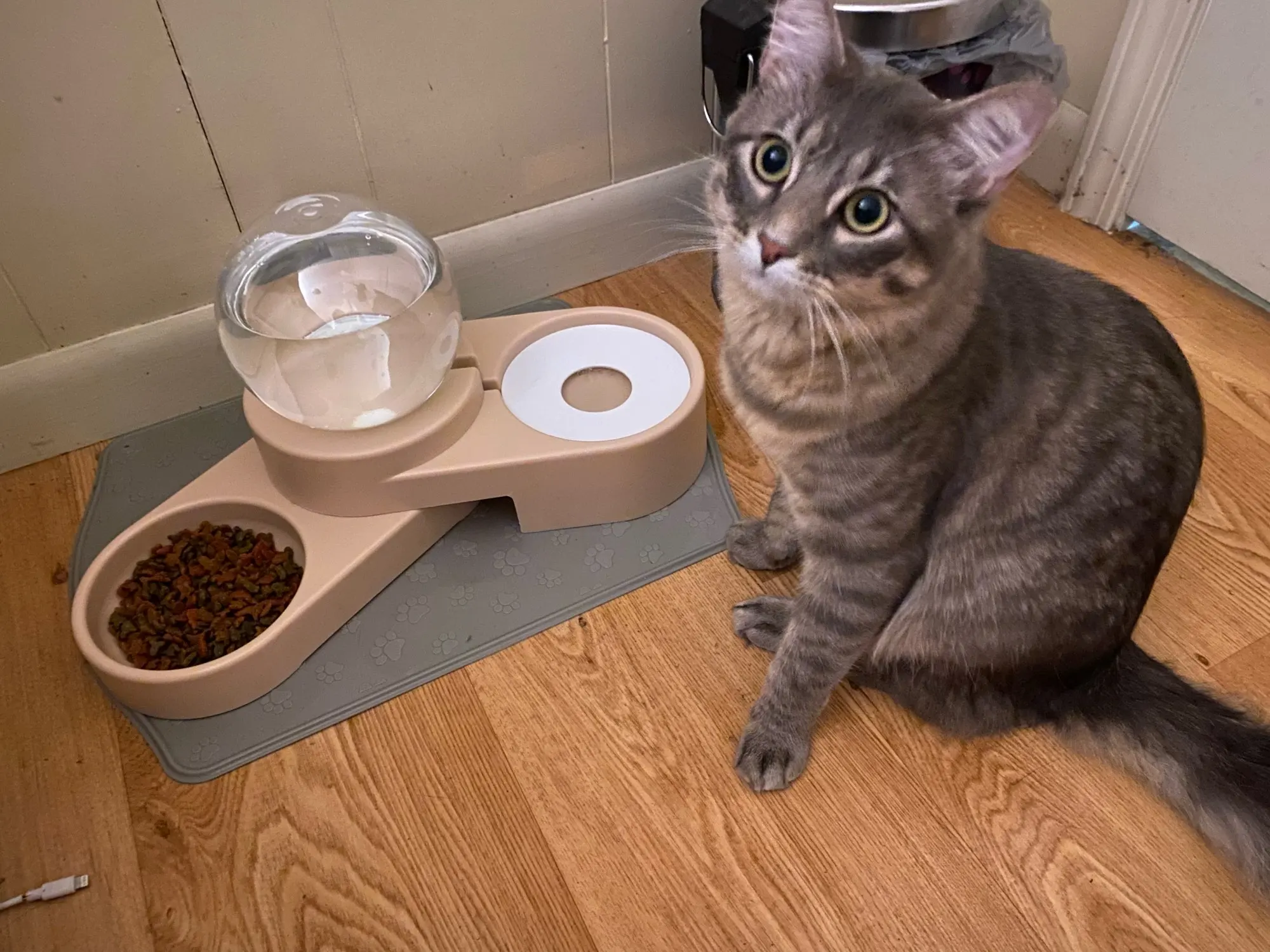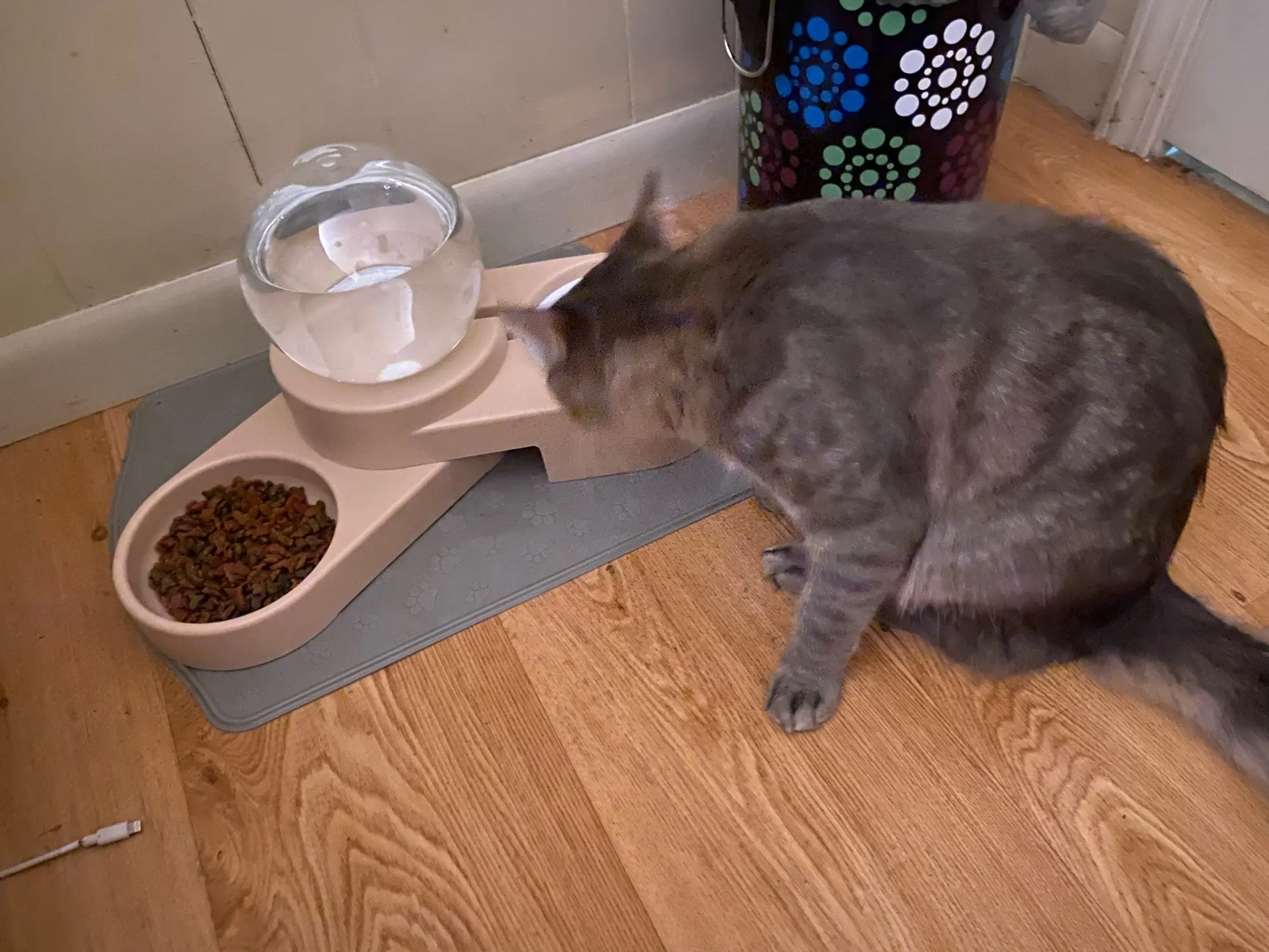 es muy pequeño, todo es plástico (no hay bol de metal como en la imagen) y los gatos derraman el agua fácilmente.