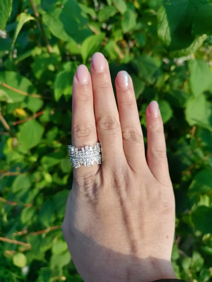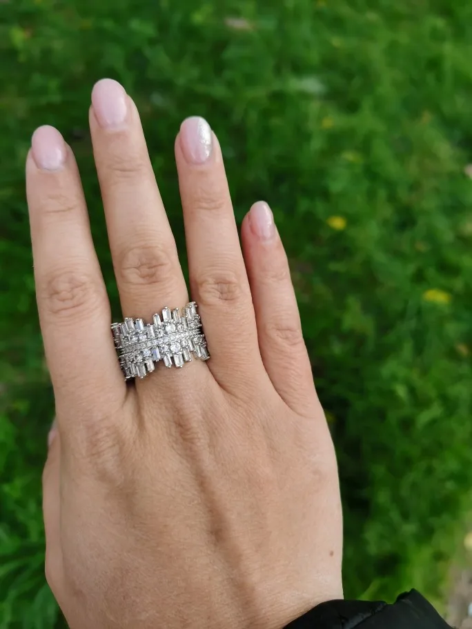 Кольцо красивое, просто прелесть. Лудше брать на полные пальцы, на тоненьких будет смотреться не очень, т.к. камни по всему периметру кольца. Великолепно смотрится на указательном пальце.
