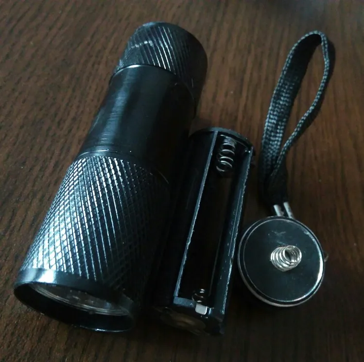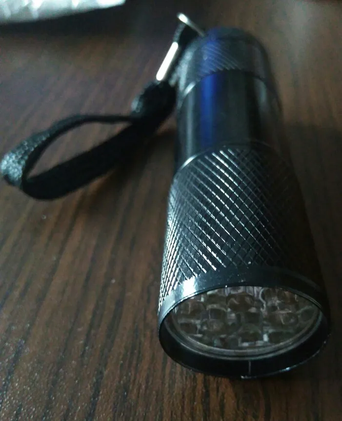 Фонарик, светящий ультрафиолетом. Покупал в комплекте с зарядным устройством (дешёвый хлам) и аккумулятором Li-ion 14500. Размер его - как у батарейки AA. Полностью заряженного аккумулятора хватает примерно на 1-2 часа непрерывного свечения. 2 режима работы: постоянный свет и мигание. Для зарядки рекомендую купить отдельное, специальное зарядное устройство для Li-ion аккумуляторов. За свою цену хороший товар. Корпус фонарика металлический, весь на резьбе и с резиновыми уплотнителями. Так что, падение в неглубокую лужу или попадание под сильный дождь фонарик наверняка переживёт. Клипса держится на 2 винтиках под внутренний шестигранник. Аккуратно сделанная вещь.