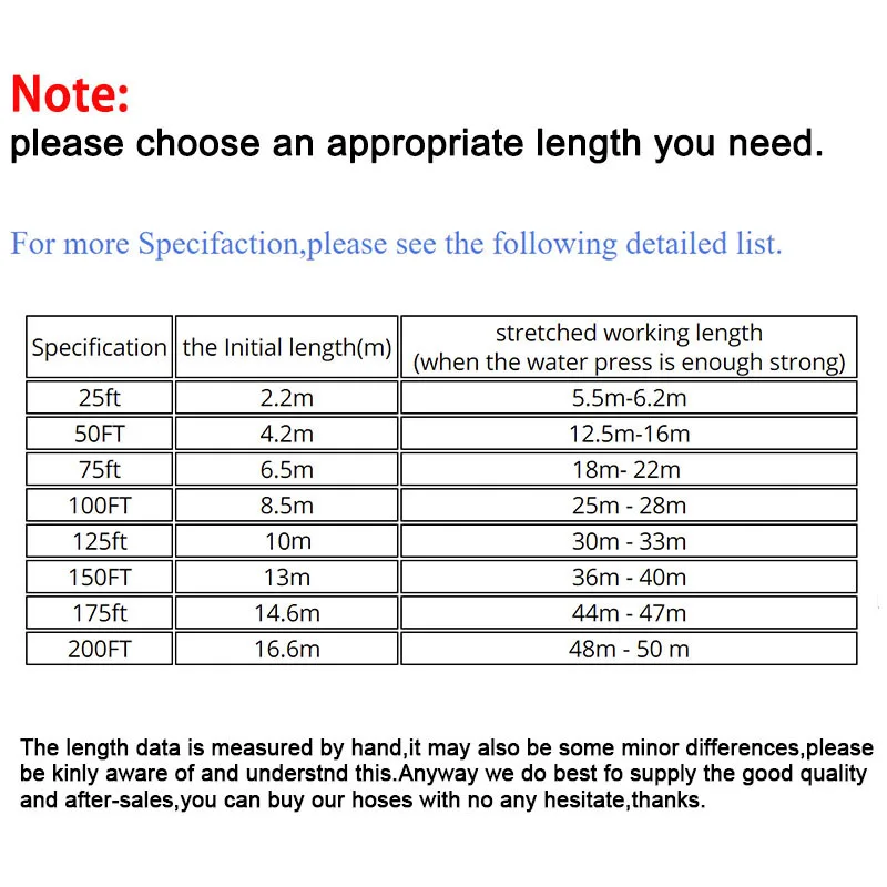 Данные о длине измеряются вручную, также могут быть некоторые незначительные различия, пожалуйста, будьте внимательны и учитывайте это. В любом случае мы делаем все возможное, чтобы обеспечить хорошее качество и послепродажное обслуживание, вы можете купить наши шланги без колебаний, спасибо.