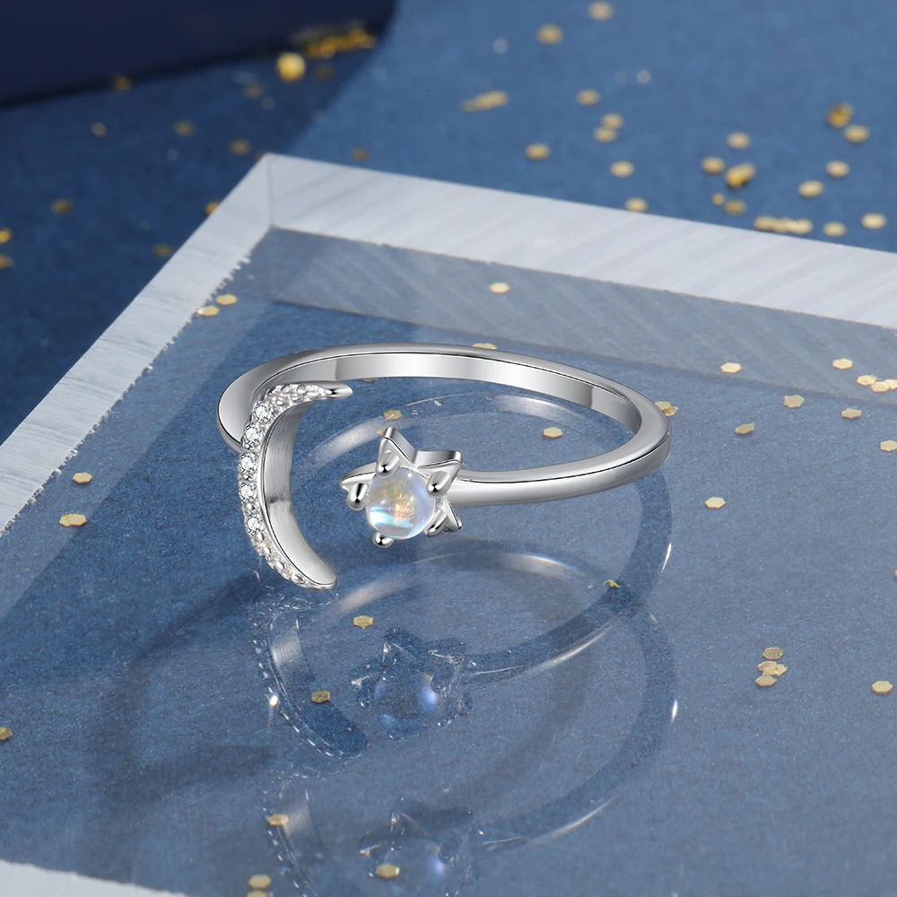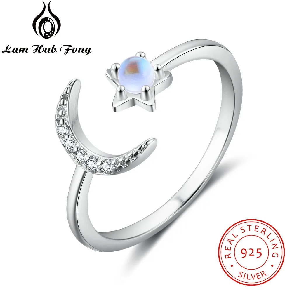 Настоящее 925 пробы Серебряное кольцо полумесяц и звезда Лунный камень кольцо с цирконием открытое регулируемое кольцо ювелирные изделия (Лам Hub Fong)