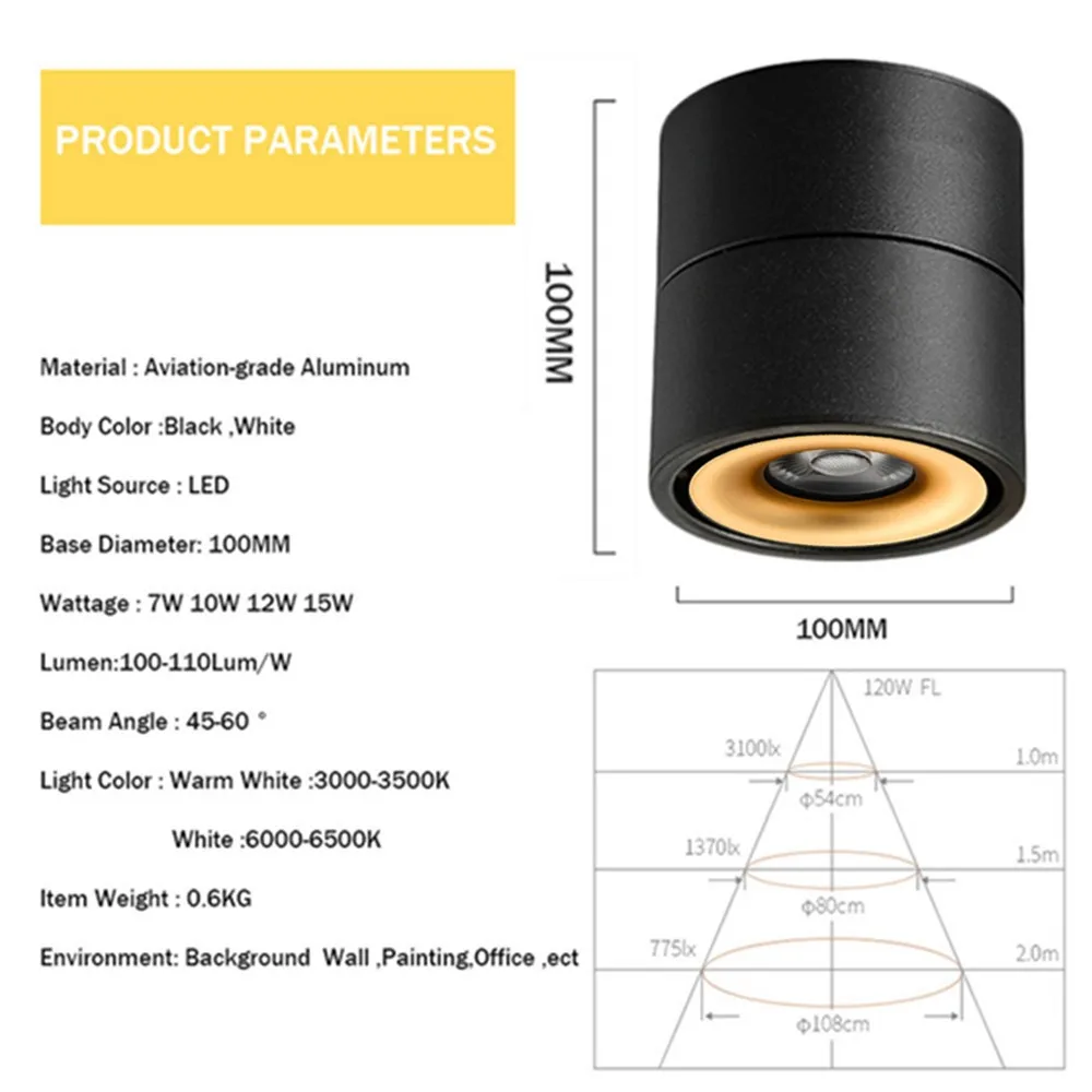 Вход: AC85-265V Материал корпуса: высококачественный алюминий Быстрое рассеивание тепла. Вращение на 360 ° и складной на 90 ° Продолжительная работа. Цвет корпуса: черный + золотой/белый + золотой Мощность: 7 Вт 10 Вт 12 Вт 15 Вт Светодиодный светильник источник/количество (шт): Высокий люмен COB, светодиодный чип epistar Люмены (лм): 100-110 лм/Вт Индекс цветопередачи: Ra >80 Светильник Цвет: холодный белый (6000-6500K)Теплый белый (3000-3500K)Натуральный белый (4000-4500K)
