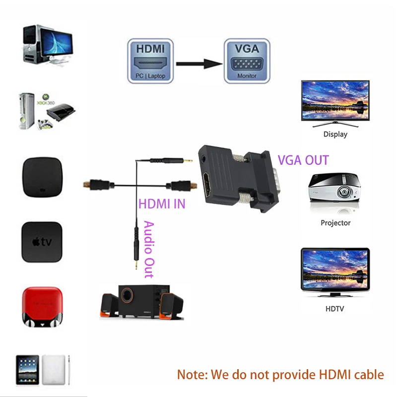 Разрешение выхода VGA изменяется в соответствии с входным сигналом HDMI.Его HDMI в VGA конвертер, выходной VGA сигнал может быть отправлен на CRT/светодиодный дисплей, и проектор, введите HDMI сигнал может быть подключен к PS3, XBOX360, Blu-Ray DVD, HD телеприставки и т. Д., выход VGA может быть подключен к домашнему CRT/светодиодный дисплей, HD TV VGA-IN, проектор VGA-IN и т. Д., может быть удобным для HD TV друзей, чтобы решить момент беспокойства.С помощью чипа цифрового преобразования, только сигнал HDMI к сигналу VGA, чтобы не сузить сигнал, зум и другую техническую обработку,Выход HDMI до 1080P/1,3, выход и выход точно такие же (точка к точке выхода).С помощью цифрового аналогового преобразователя, высокоскоростной HDMI видеосигнал высокой четкости может быть преобразован в аналоговые сигналы, в то время как аудио разложения, так что обычное отображение видео высокой четкости приносит удовольствие.100% Новый брендHDMI Женский к VGA Мужской конвертер/адаптерПодключите ваши устройства только одним кабелем HDMI, больше не нужен кабель VGAВстроенный Расширенный активный микросхема IC, преобразует цифровой сигнал HDMI в аналоговый сигнал VGA и стерео аудио сигналПоддержка Max Full HD 1080P / 60 ГцПодключи и работай, прост в использованииHDMI видео входные форматы: 480i / 576i / 480p / 576p / 720p / 1080i / 1080pФорматы видеовыхода VGA: 480i / 576i / 480p / 576p / 720p / 1080i / 1080pПоддержка HDCP 1,0/1,1/1,2Поддержка HDMI 1,1/1,2/1,3Аудиовыход: 3,5 аудио стерео R + LВыходной терминал: VGA + аудиоПосылка:1 * адаптер HDMI-VGA1*3,5 мм стерео аудио кабель