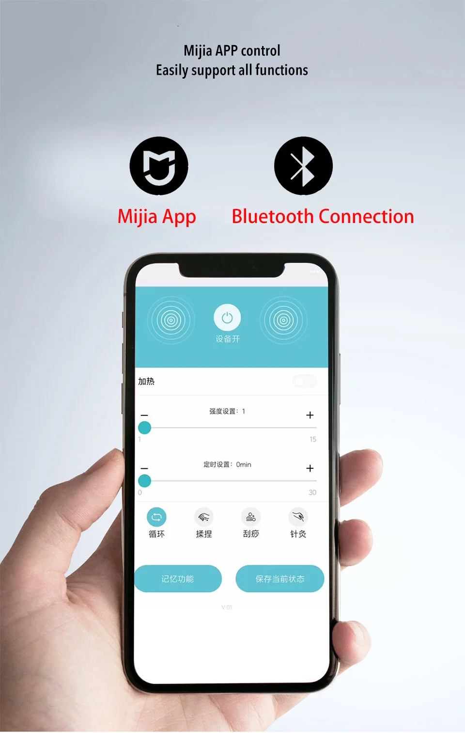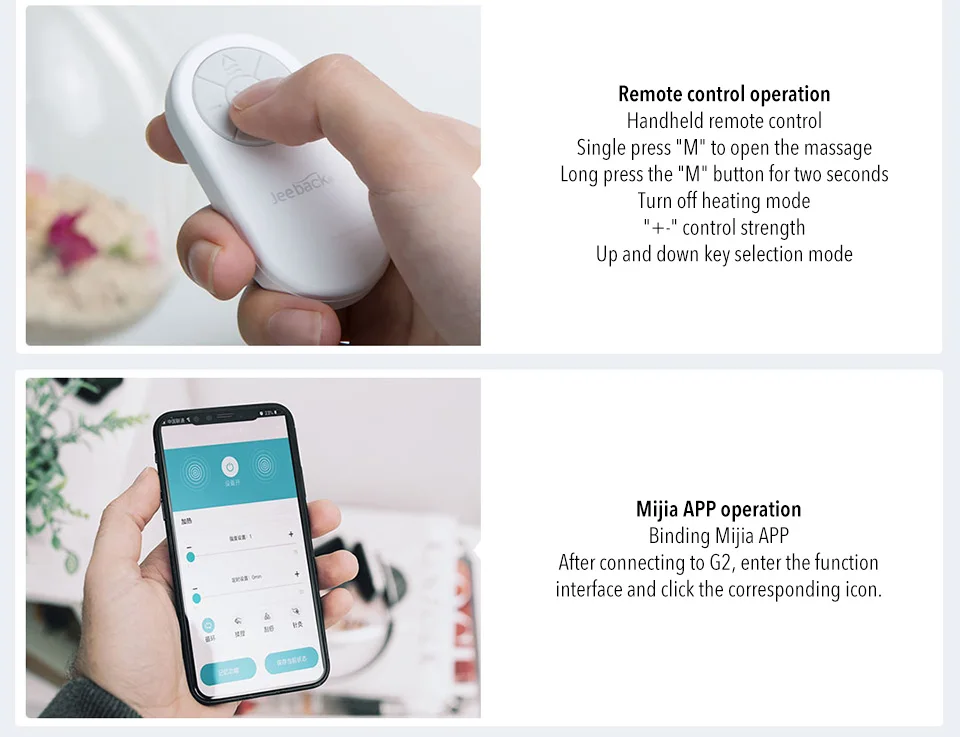 -Бесплатный контроль через приложение Mijia. Пользовательский интерфейс легко понять, и вы можете быстро войти в свой любимый режим массажа. Одним нажатием кнопки «функция памяти», чтобы быстро восстановить настройки, когда G2 был в последний раз использован.
