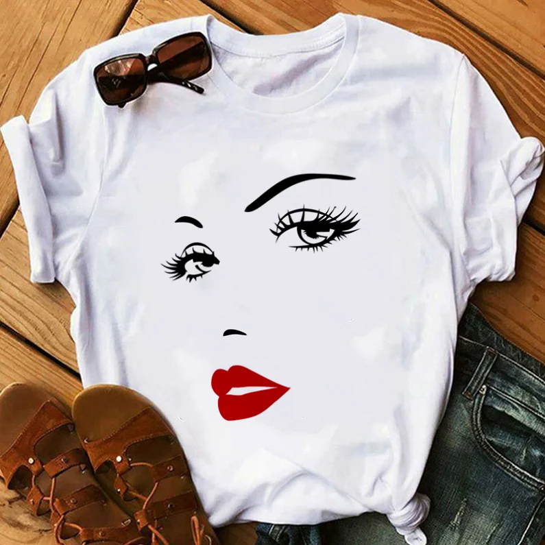 Футболка женская в стиле Харадзюку, повседневная винтажная в хипстерском стиле, с принтом лица и красных губ, с графическим принтом, в Корейском стиле