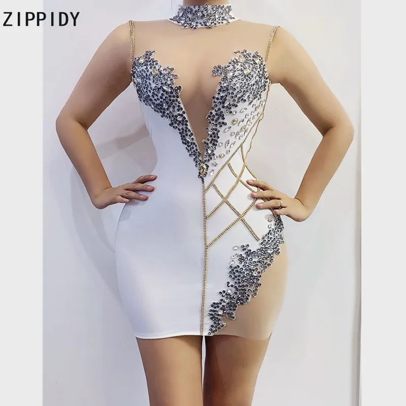2021 стразы, прозрачное белое мини-платье на грудь, платье на день рождения, наряд для танцев на выпускной, женское платье для выступления певицы
