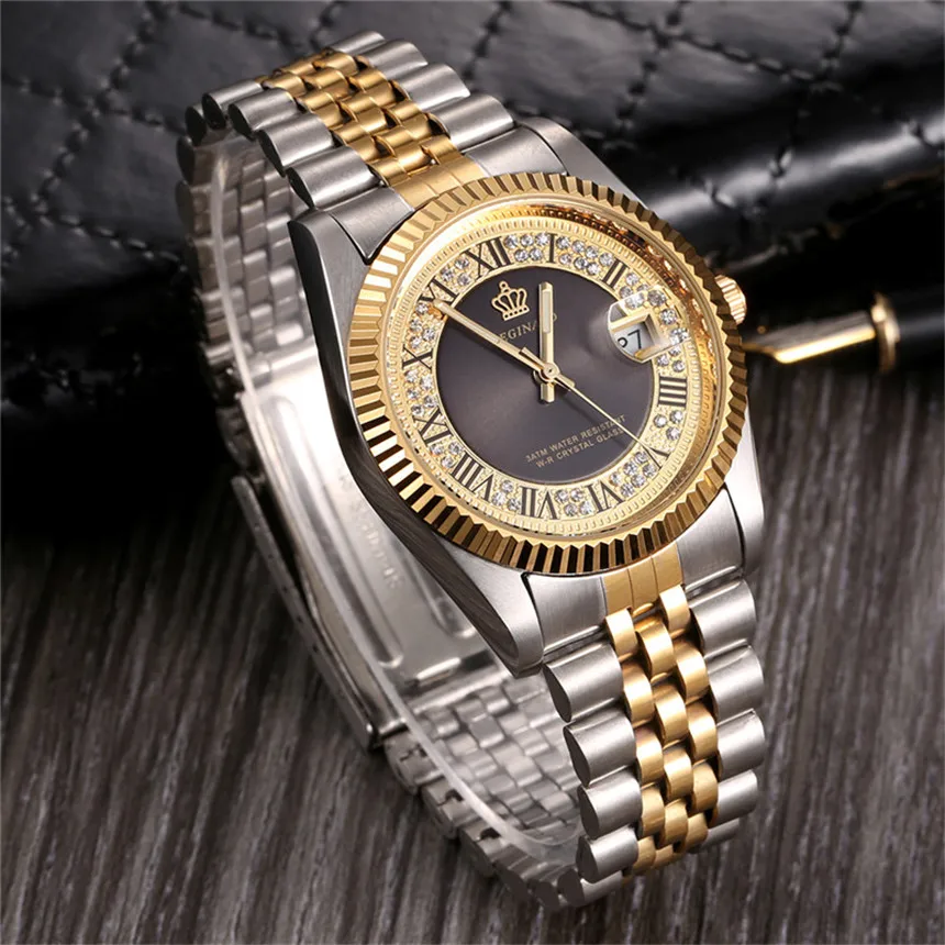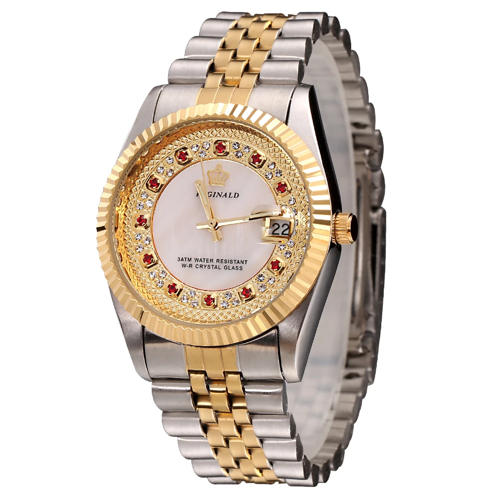 Оригинальные новые мужские кварцевые часы REGINALD 2018, желтое золото 18 К, рифленый Безель, жемчуг, Алмазный циферблат, полностью из нержавеющей стали, светящиеся часы