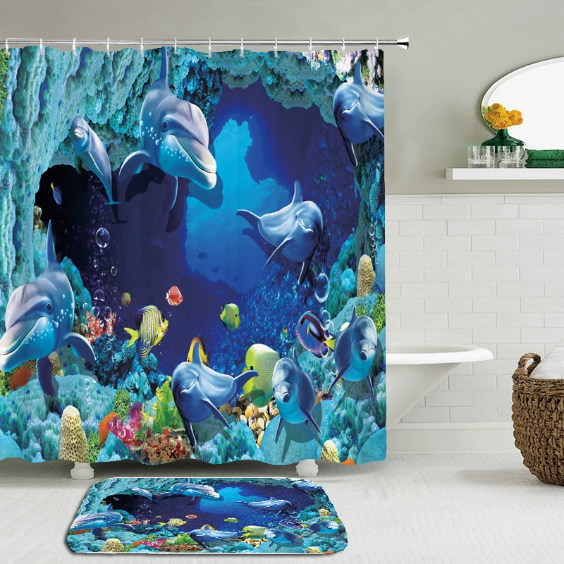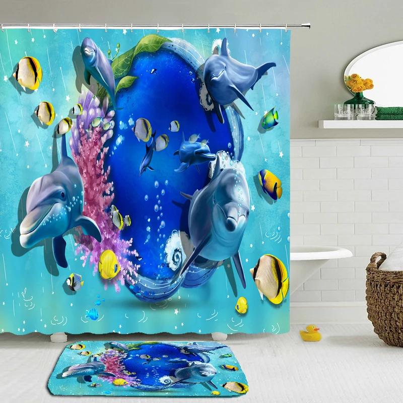 2 шт. океанские морские дельфины, занавески для душа, набор для ванной, водонепроницаемая полиэфирная ткань с нескользящим напольным ковриком, набор для ванной занавески