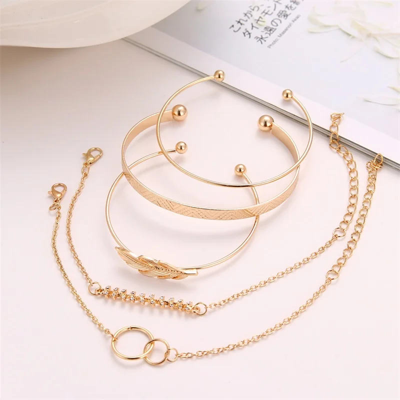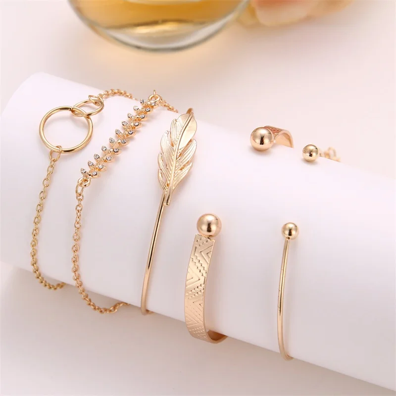 Набор круглых браслетов из сплава в стиле ретро, богемный металлический ювелирный браслет геометрического дизайна, 5 шт.компл., перо золотистого цвета