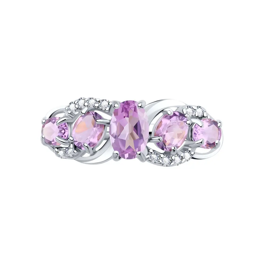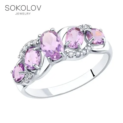 Кольцо SOKOLOV из серебра с аметистами и фианитамиЛюбители изящных и женственных украшений по достоинству оценят кольцо из серебра с аметистами и фианитами. Украшение порадует гармоничным дизайном с использованием натуральных камней и демократичной ценой. Сияющие фианиты подчёркивают по-весеннему нежный сиреневый цвет аметистов. Купите серебряное кольцо SOKOLOV и добавьте своему образу стильную и утончённую деталь.