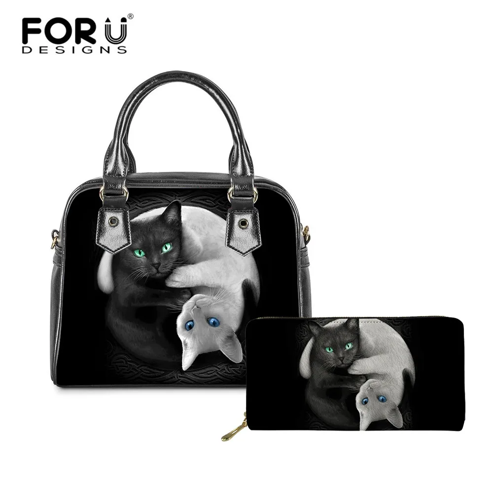 Модные женские сумки через плечо FORUDESIGNS, милые белые, черные сумки-мессенджеры из искусственной кожи с принтом кота, 2 шт.компл., повседневные сумки-тоут