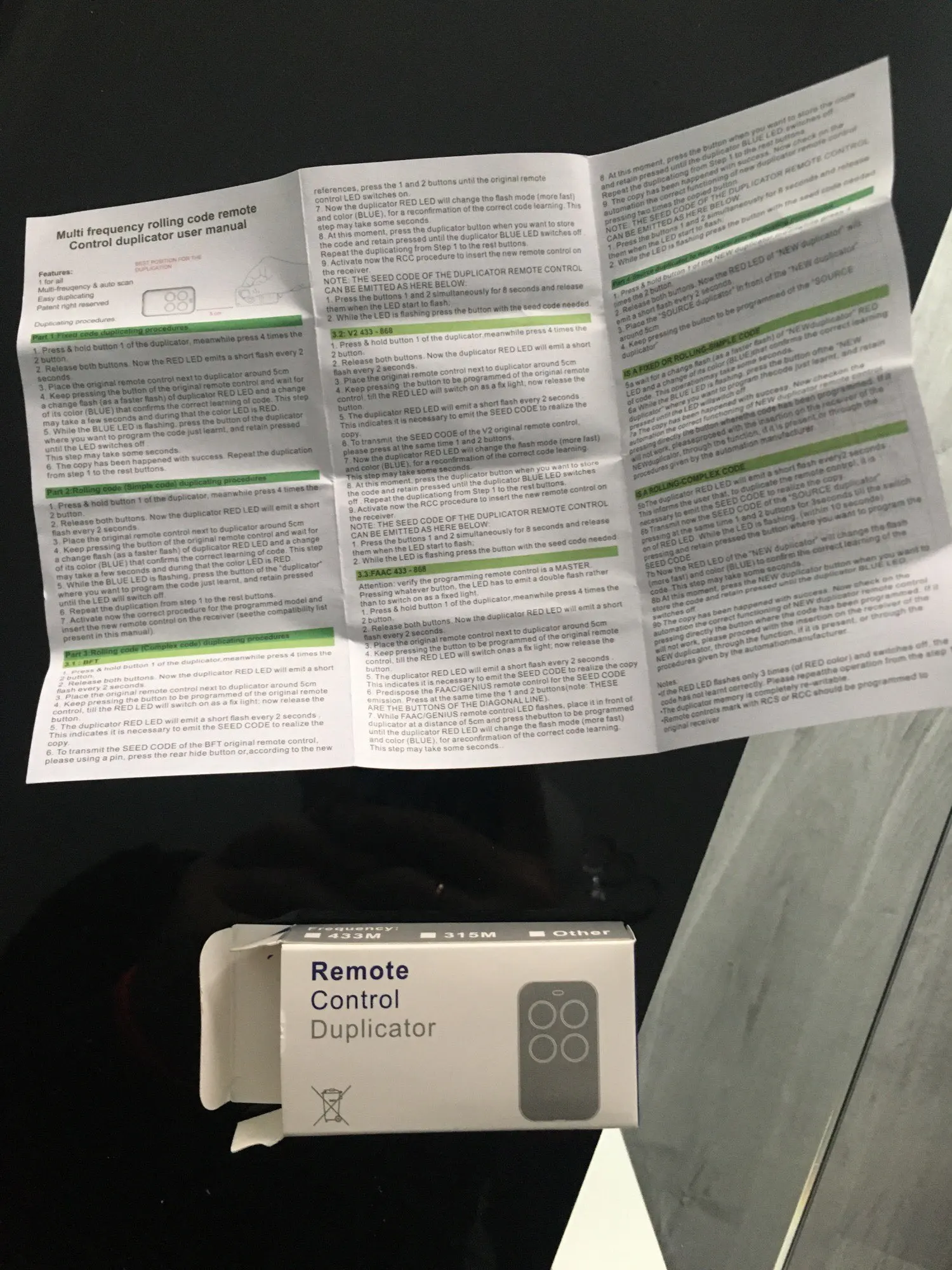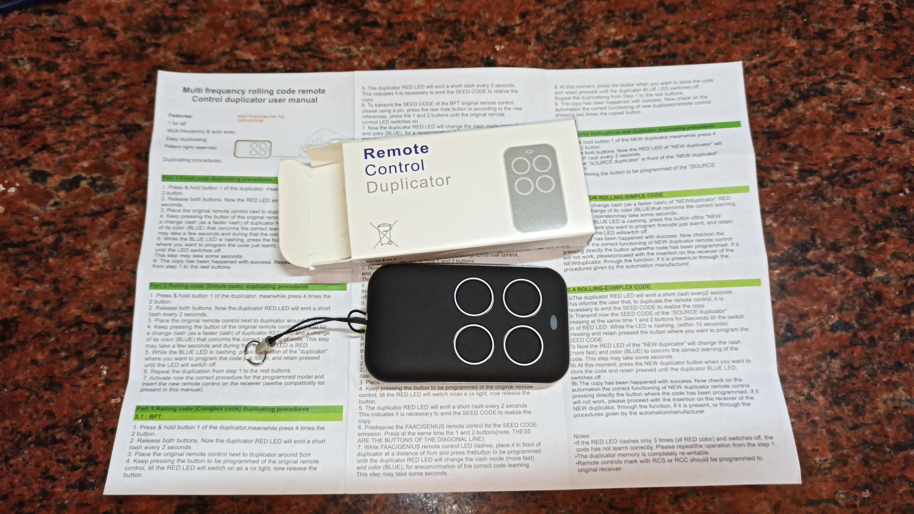 Лучшее, что я когда-либо покупал. Он работает очень хорошо даже в гараже, с 3 различными моделями, также многочастотный, не работает. Мощный сигнал, очень легко программировать (включает инструкции) и доставку в течение 15 дней в Испанию. Товар и Продавец настоятельно рекомендуем. Я обязательно куплю больше.