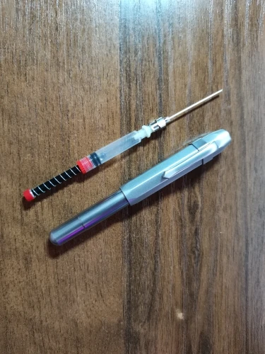 Вполне себе нормальный шприц, удобно набирать, НО не совсем удобно заправлять ручку, а неудобство состоит в том, что поршень туговато ходит и подача получается рывками, что не очень хорошо, так как можно разбрызгать чернила. На мой взгляд медицинский шприц удобнее, хотя может ещё разработается