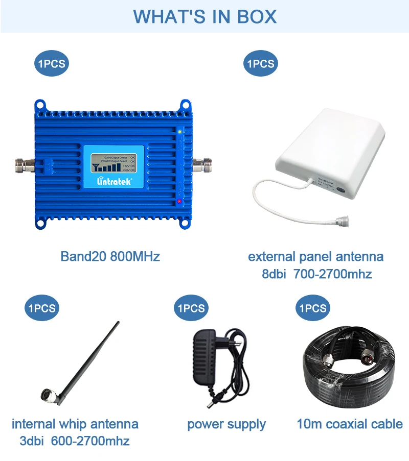 Усилитель сигнала LTE 1,4G, расширение сигнала B20 800 МГц.2. Покрытие: покрытие около 300-1000sqm без каких-либо преград, но одна антенна в основном может покрыть около 300 квадратных метров. Этот ретранслятор может работать с 1-3 комнатными антеннами.3,70 дБ с высоким коэффициентом усиления, 20 дБм большая выходная мощность, может пройти через барьеры легче.4. Компактный размер, низкое потребление, простота установки, большое покрытие, подходит для домашнего/офисного использования.5. Устройство, с антеннами и кабелем, полный комплект ретранслятора.6. Улучшите ваш мобильный сигнал, больше не будет плохого приема, больше не будет падений звонков.7. С ЖК-дисплеем можно указать состояние сигнала.8. Функция ALC/AGC, низкие помехи для базовой станции.