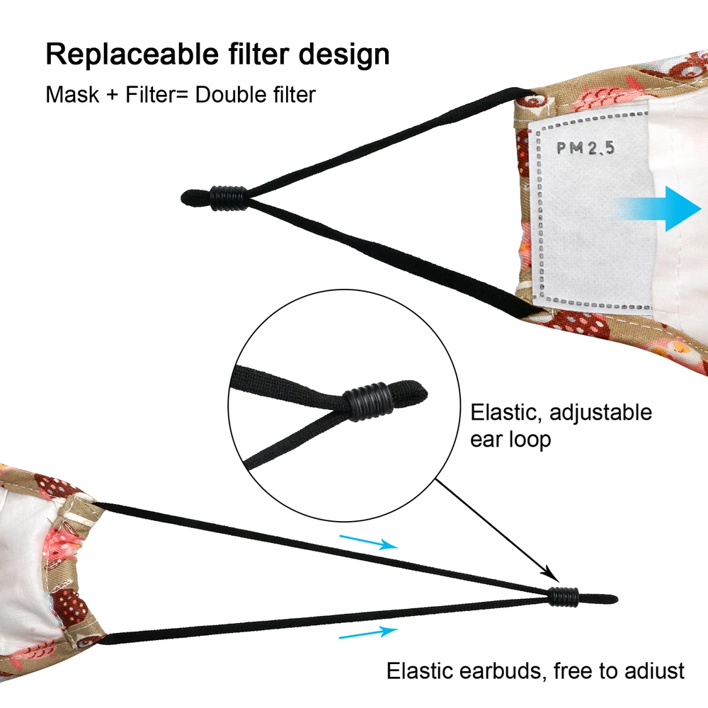 Примечание: Только хлопковая маска моющаяся и многоразовая, фильтры вставляются одноразовые и должны быть заменены. Мы предоставляем 2 шт фильтров, вставляемых в этот продукт бесплатно, если вы хотите больше, вы можете посетить наш магазин и приобрести больше фильтров индивидуально.
