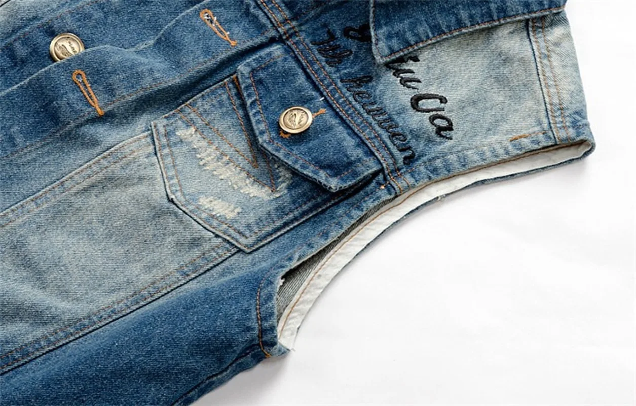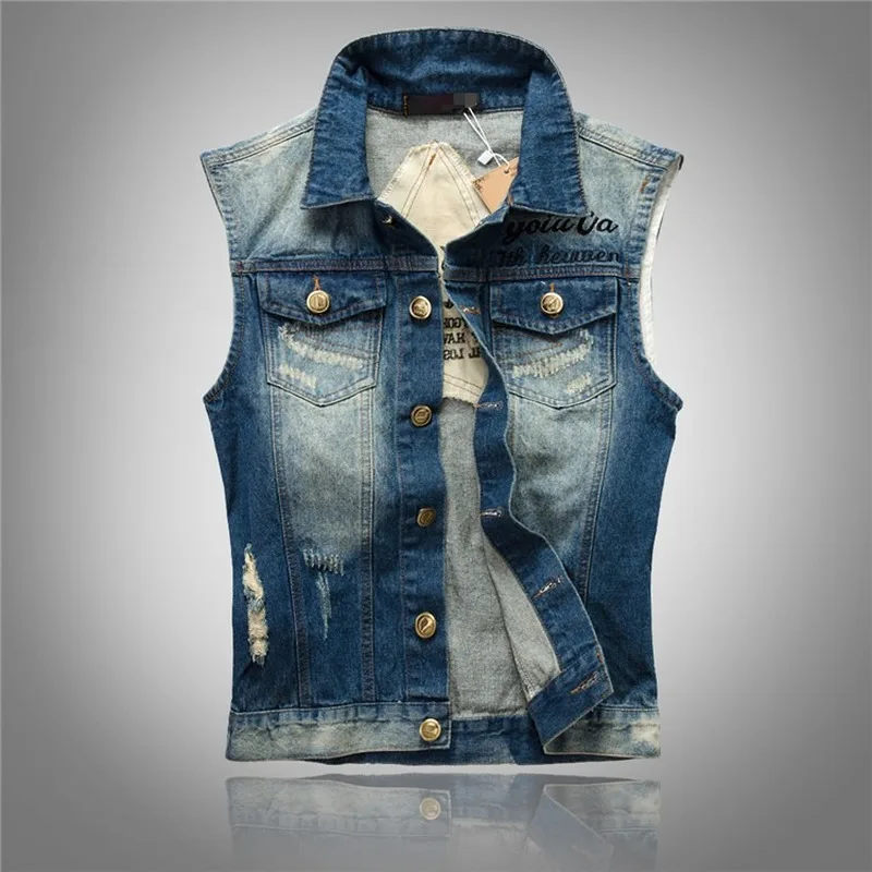 Джинсовая безрукавка мужская с дырками, приталенная верхняя одежда ...