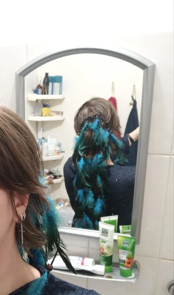 перья сильно мяты, но она красивая, на все волосы ниже лопаток перья распределены, очень нарядно. взяла для этнофестиваля, буду фестивалить)