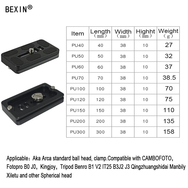 Спецификация:Модель: PU120/150/200/300AМатериал: алюминийСтандарт пластины: Arca swissВес: 75/110/135/222gРазмер: 120/150/200/300*38*10 ммШирина пластины: 38 ммТехнология: Анодное окислениеВинт камеры: Кольцевой винт UNC1/4Примечание:1. Возможны отклонения в 1-3 мм из-за ручного измерения.2. Из-за различных дисплеев и другого светильник, изображение может не показать фактический цвет товара. Спасибо за понимание.