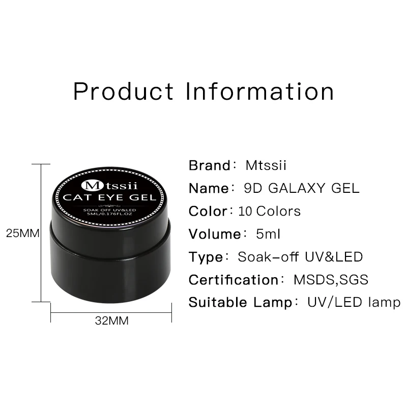 Спецификация: Тип товара: гель для ногтей Ингредиент: УФ Гель-лак Объем: 5 мл Количество: 1 шт. Тип: Гель-лак Био-Гели Soak off: Да Отверждение: УФ светодиодная лампа Эффект: магнитное крепление Комплект поставки: 1*5 мл Магнитный Гель-лак Шаг за шагом: 1. Очистите ногти, затем обрежьте поверхность ногтей, как обычный процесс дизайна ногтей. 2. Полностью встряхните Гель-лак, он может сделать Цвет гель-лака сбалансированным. (ВАЖНО) 3. Сначала нанесите Базовое покрытие, которое может сделать Гель-лак длительным дольше, вылечите УФ-лампой или светодиодной лампой. (Необходимо) 3. Нанесите слой черного геля и вылечите его. (необходимо) 4. Нанесите первый слой магнитного геля и вылечите его. 5. Нанесите второй слой магнитного геля, держите магнит близко к поверхности ногтя в течение 5-10 С и вылечите его. 6. Нанесите верхнее покрытие и вылечите его. Как удалить УФ-Гель-лак для ногтей: • Замочите ногти в стеклянной миске, заполненной небольшим количеством чистого ацетона, или оберните каждый ноготь ватным диском, смоченным чистым ацетоном, в течение 5-10 минут. • Продукт станет мягким, и вы можете аккуратно отпиливать его или сползать с помощью небольшой деревянной палочки.