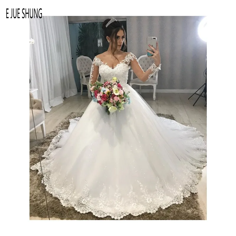 Роскошные кружевные свадебные платья E JUE SHUNG с аппликацией, прозрачные Свадебные платья с длинным рукавом и пуговицами на спине, robe de mariee
