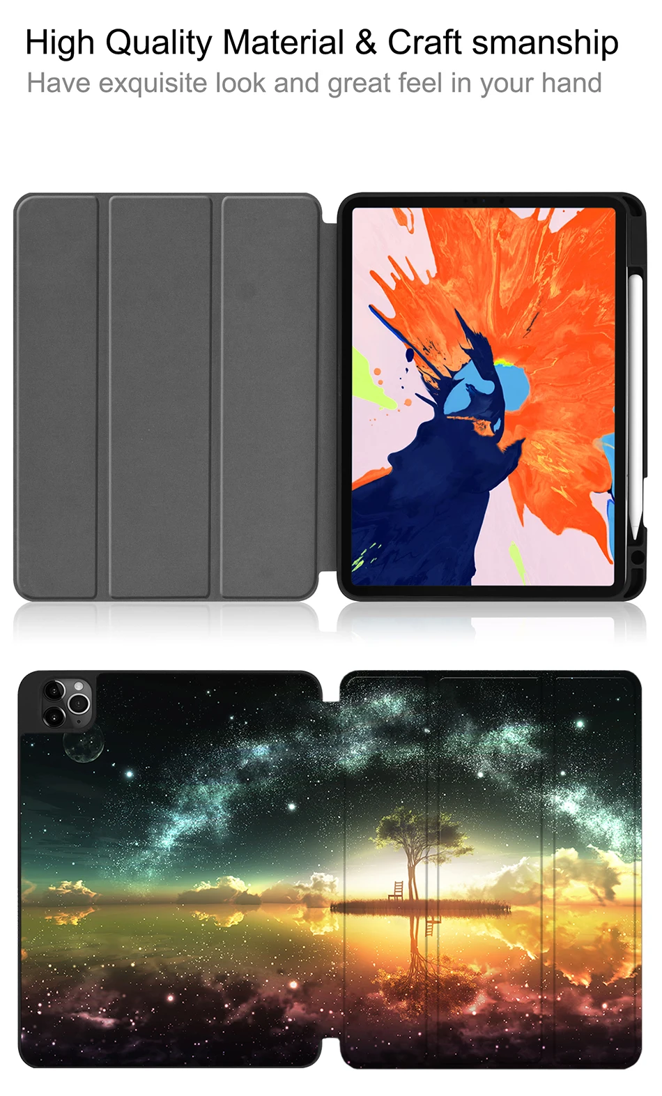 [Трехстворчатая подставка]: Встроенные магниты, складываются в подставку. Трехстворчатая передняя крышка с двумя стоящими позициями для комфортного ввода клавиатуры и просмотра фильмов с углом обзора, который отличается от трехкратного.