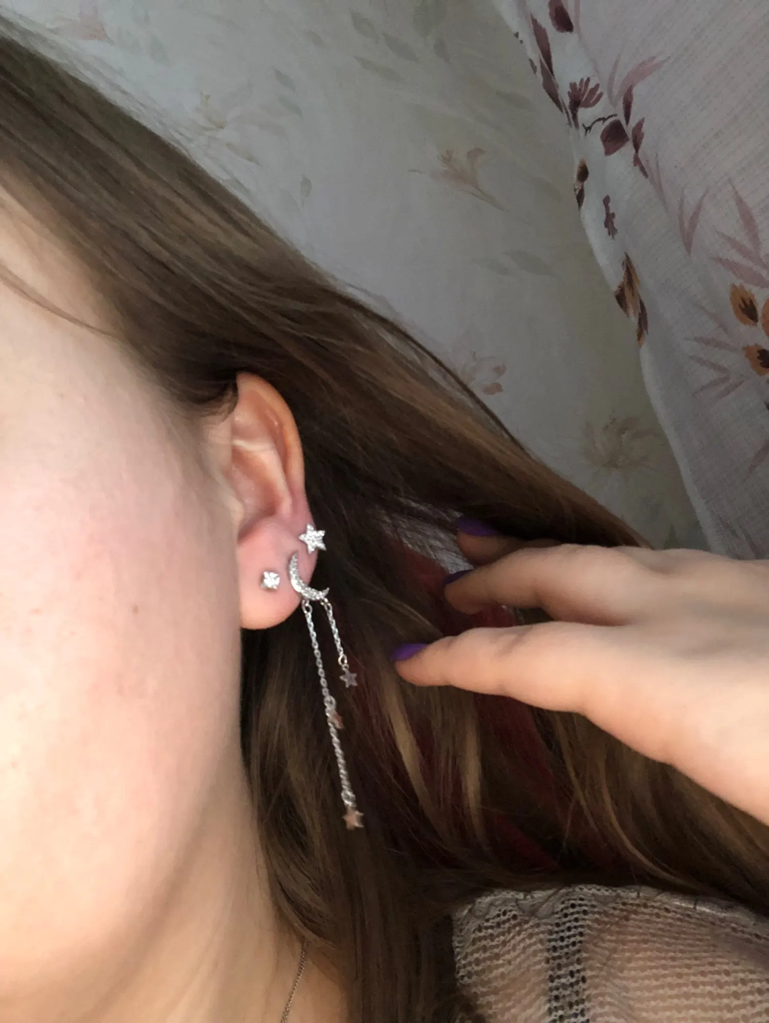 Серьги будут сидеть в зависимости от того как у вас расположены проколы, если все хорошо то будет красиво, а так притензий к исполнению нету) они весьма плотно задвигаются и не выпадают, даже спать почти не мешают, а это было для меня проблемой, а теперь могу носить их на постоянку, очень удобно, спасибо) это не серебро, боюсь что разве что от воды могут потемнеть
