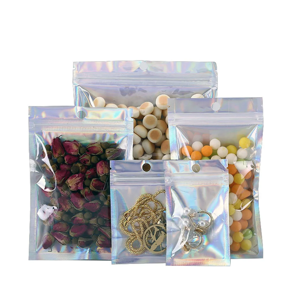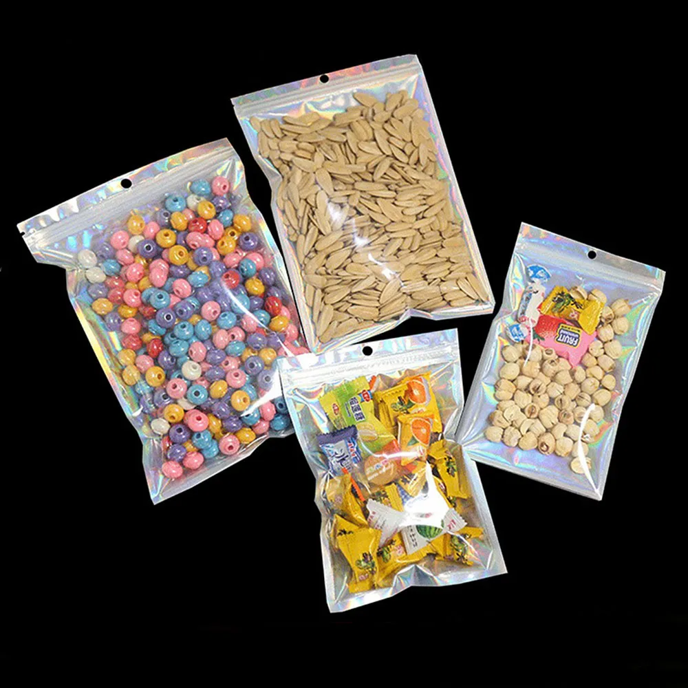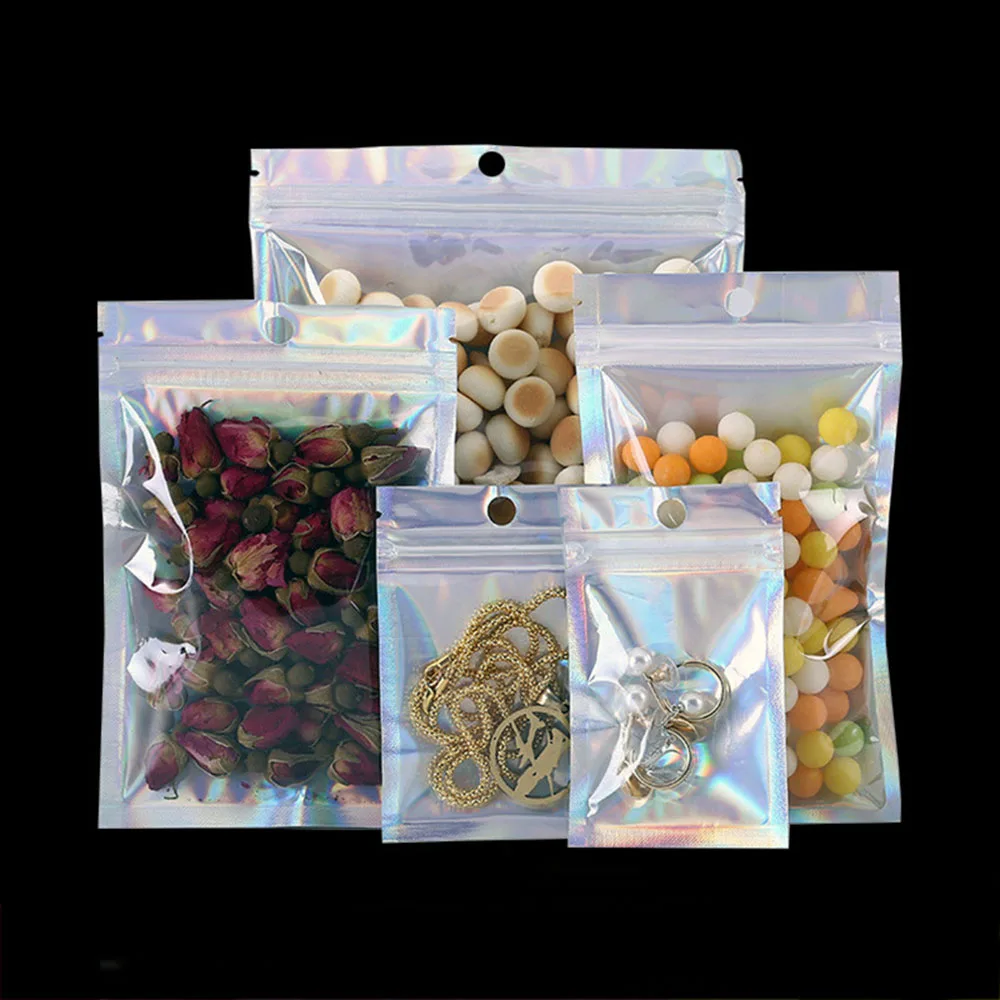 100 шт. плоская солевая косметичка для ванн с застежкой-молнией, прозрачная голографическая лазерная мини-сумка из алюминиевой фольги, плотные пакеты
