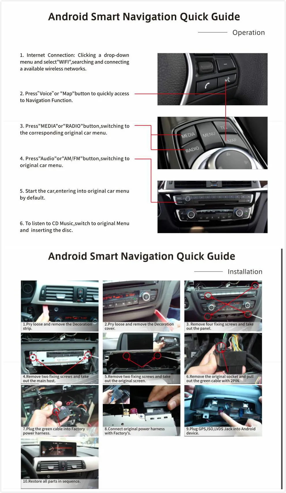 1. Совместим с автомобилями с оригинальным экраном6,5/8,82. Совместим с автомобилями с/без оригиналаФункция навигации.3. Совместим с автомобилями с/без оптикиВолокно.4. Совместим с заводским Canbus, поддержкаIDrive, управление рулевым колесом, информация о автомобиле.5. Поддержка оригинального радио6. Встроенный Bluetooth и поддержка оригинальногоBluetooth.7. Поддержка управления Idrive в меню Android.8. Поддержка оригинальной камеры заднего вида.9. Поддержка оригинальной траектории парковки/радара.10. Поддерживает AUX переключатель автоматически.11. Поддержка переключения на оригинальный дисплейЭкран и функции.12. Только один экран, без внешней коробки, легкоУстановите, подключите и играйте.13. ID7 / ID6 / EVO стиль меню переключатель свободно