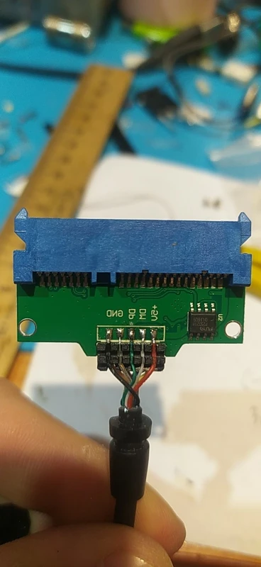 Всё отлично. Жаль с HDD 3.5 не работает. Пытался хитро переделать, для 3.5: 1) припаял DC-DC повышающий преобразователь для того, чтобы запитать 12V 13, 14, 15 клеммы, которые были пустые. 5V взял с USB 2.0. диск раскрутился, но не определился. 2) В схеме были ещё на 1, 2, 3 3.3V. Спаял делитель напряжения. Без подключения жесткого решил проверить, резисторы сильно нагрелись, это и понятно маломощные ( других не было, нужно делать на транзисторе). 3) Плюнул, так и не запитав 3.3V 1,2 и 3 клеммы. . Если верно, то нужно на транзисторе делитель сделать и взять источник питание помощнее 5V 5А. Утром проснулся с идеей. Был у меня HDD 3.5 в корпусе с платой и доп. питание. Разобрал корпус, прикрутил к нему его же плату, так как она держалась только на жестком диске, отпилил часть пластиковую оболочку, для того, чтобы вставлять и вынимать жёсткие диски и получилась самодельная Док-станция, в который можно поставить жёсткий диск и спокойно его снять, фото прилагаю.