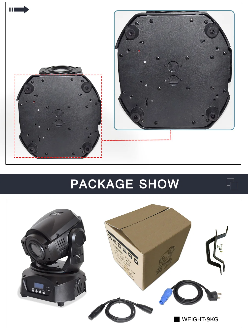 Описание товара• Светодиодный прожектор с высокой выходной подвижной головкой• 1x светодиодный 90 Вт• Угол луча 13 градусов• Моторизованный фокус• 3 режима работы: звук активный,Режим показа и управление DMX• 4 встроенных освещения• 16 каналов DMX• 7 цветов + белый с половиной цвета + пятен• 1 вращающееся колесо gobo: 6 вращающихся gobos + 1 стеклянный gobo с прыжком и вращением• 1 статическое колесо gobo: 8 gobos + белый с эффектом скачка• Электронное Затемнение: 0% - 100%• 5 кривых диммера• Обратный режим панорамирования/наклона для контрастного движенияКогда приспособления соединены вместе• Быстрое движение наклона панорамирования• Панорама: 540 градусов; Наклон: 270 градусов• Эффект дрожания Gobo• 16-уровневая Fine Pan/Tilt контрольный• Пресс-форма-4-кнопка DMX светодиодный меню с 180 ° обратный режим просмотра• Шаговые двигатели с микрошаговым механизмом• Включает Омега кронштейн для крепления фермы• 3-контактный XLR Сделано в Китае внутрь или наружу• Охлаждение вентилятора• Эффект стробоскопа/импульса; Случайный стробоскоп медленного до быстрого• Светильник источник света: 1x90 Вт, холодный белый свет, светодиодный CT: 8500K• Длительный срок службы светодиодный (номинальная составляет примерно 50000 часов)• Многофункциональное напряжение: 100-240 В, 50 Гц/60 Гц• Потребляемая мощность: 140 Вт• Размеры (ДхШхВ): 230x230x340 мм• Вес: 9 кг. Посылка включает в себя1 x сценический светильник1 х вилка1 x Омега кронштейн2 винта1 x Руководство пользователя