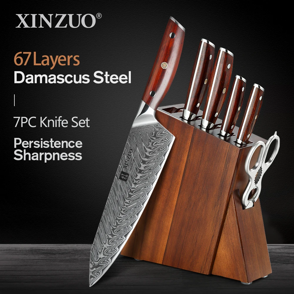 Подставка для ножей XINZUO из дерева акации, набор ножей из высокоуглеродистой дамасской стали, держатель для ножей с рукояткой из розового дерева