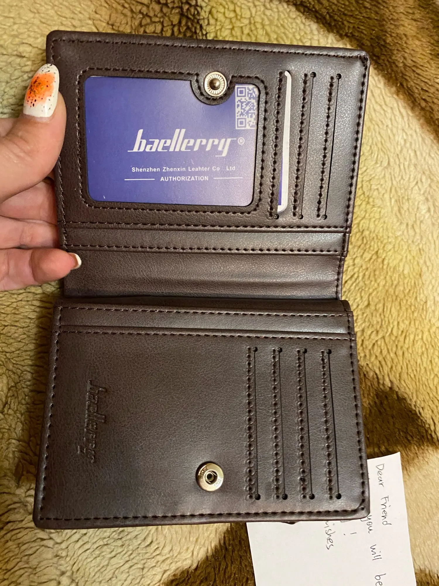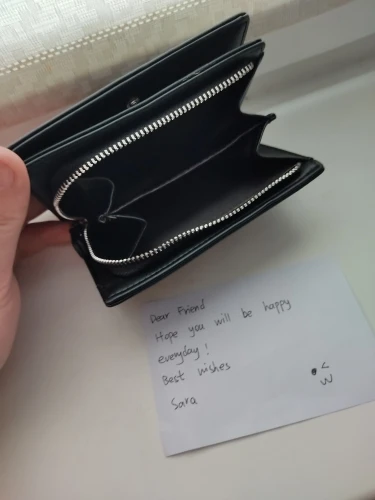 Пришел товар быстро, за 10 дней! Кошелек удобный, все хорошо работает! Была приложена записочка с пожеланиями! Спасибо! Очень приятно!