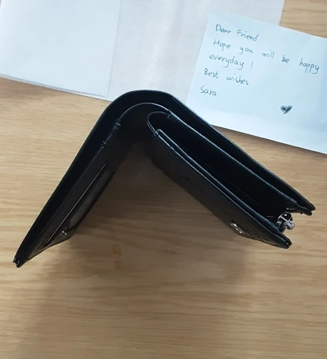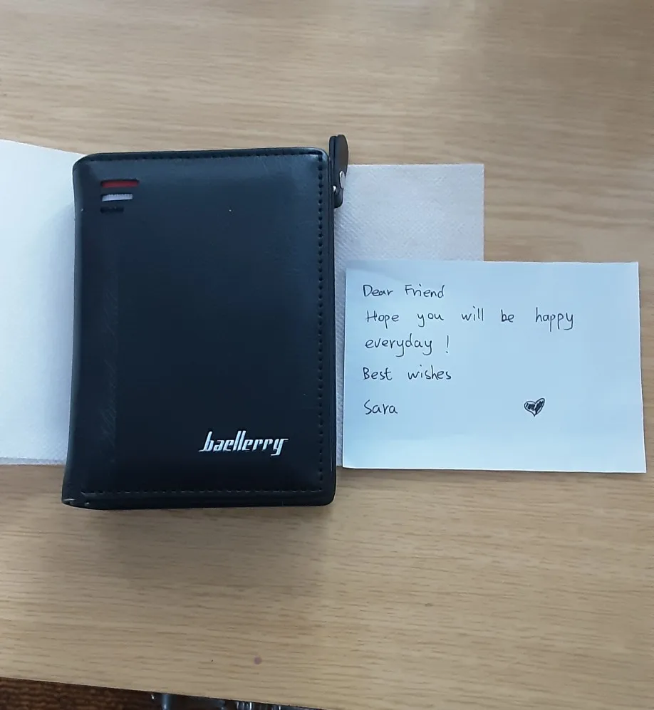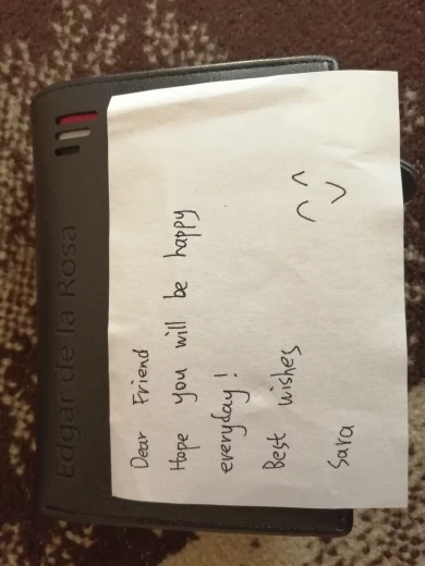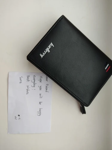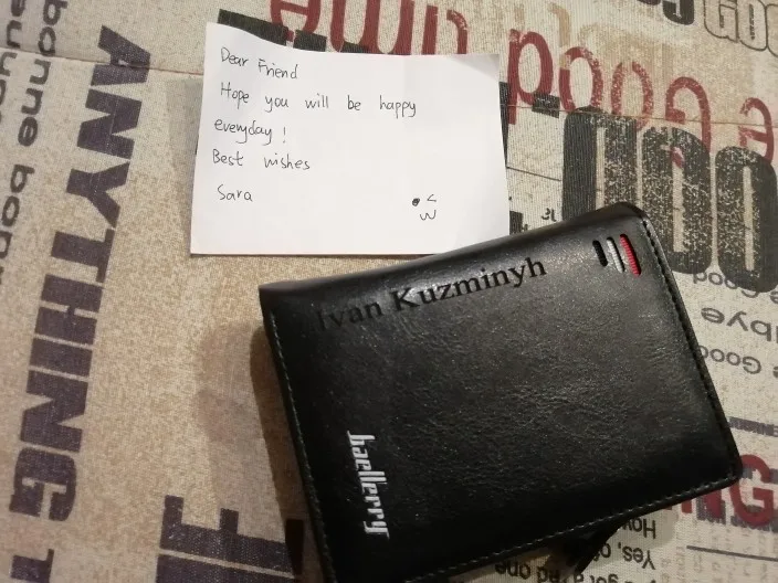Хороший кошелёк и приехал быстро. Трек отслеживался. Упаковано аккуратно. Запаха нет. Надпись, что попросила сделали. Продавец вложила записочку, написанную от руки с добрыми словами. Спасибо большое, очень приятно. Брала на подарок мужу, думаю, ему понравится. Товар и продавца, однозначно, рекомендую.