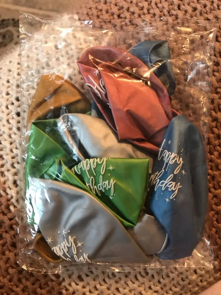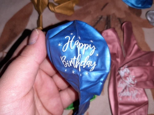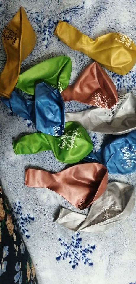 10 шаров- 5 цветов по 2 шт каждого, с надписью happy birthday. Цвет шаров металлический синий, зелёный, серебристый, золотой и непонятно-красный. В надутом виде-просто ! Но запах оставляет желать лучшего. Но это мелочи, главное - украшение праздника! Надеюсь, ребёнок оценит. Доставка-молния!