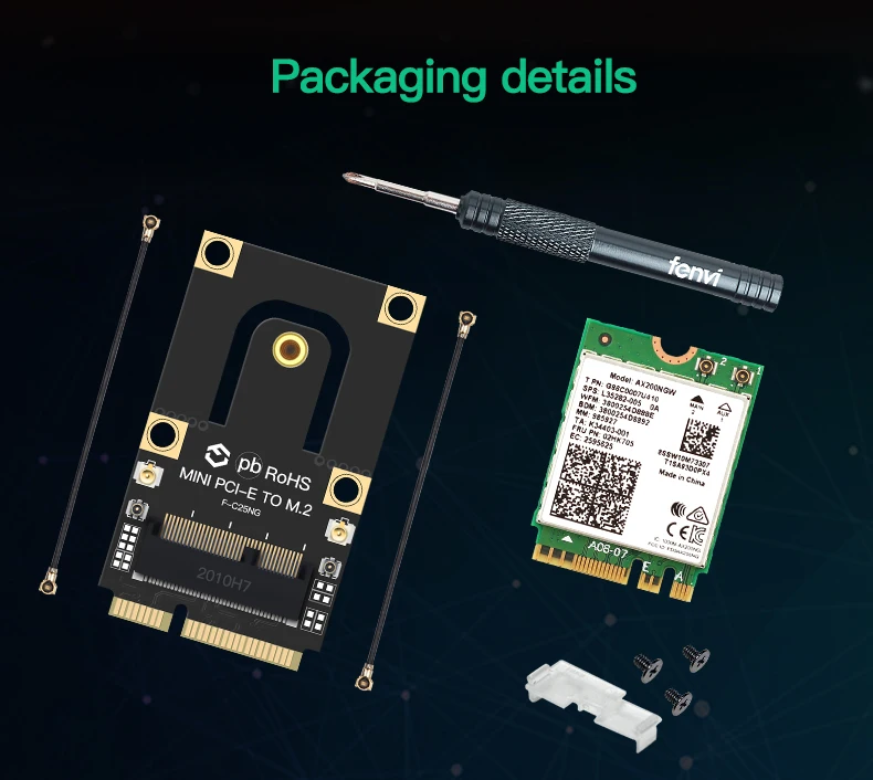 Отличный набор Fenvi в комплекте с отвёрткой, тремя крепёжными винтами, двумя антенными проводами с разъёмами MHF4 (маленькие) и пластиковой защитой на сетевую карту. Доставка до Москвы за 2 недели!