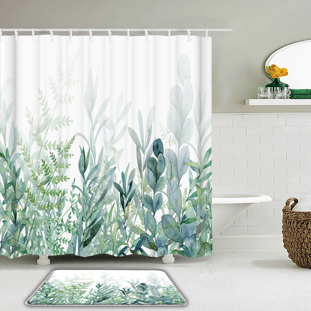 Занавеска для душа с зелеными листьями растений, комплект из 2 пред...