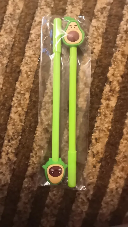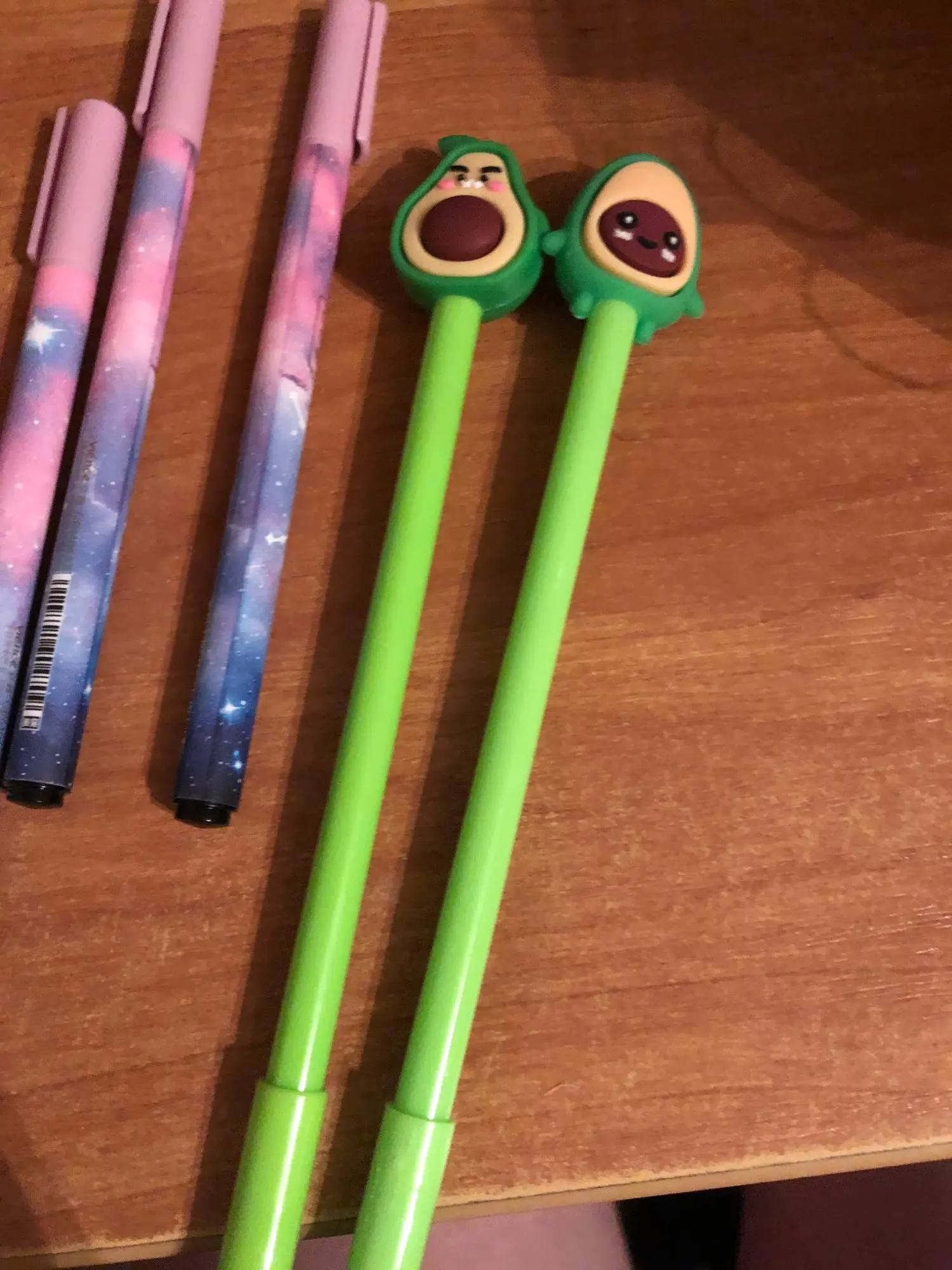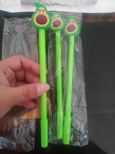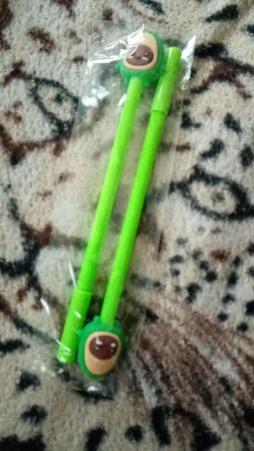 Ручки красивые, чернила чёрные, гелиевые. Заказала 2, пишут отлично и очень мягко. Авокадо можно снять с самой ручки. Советую