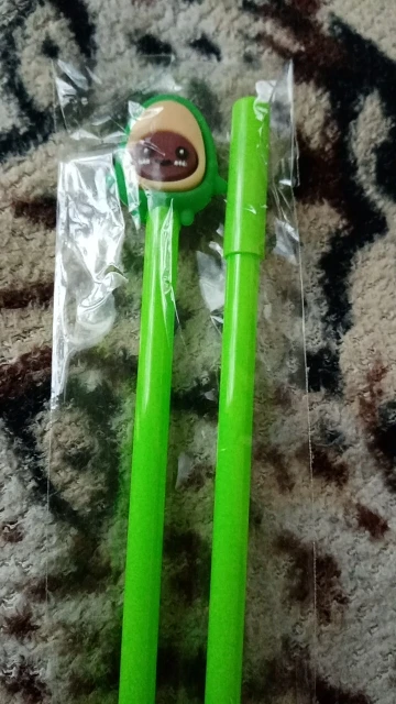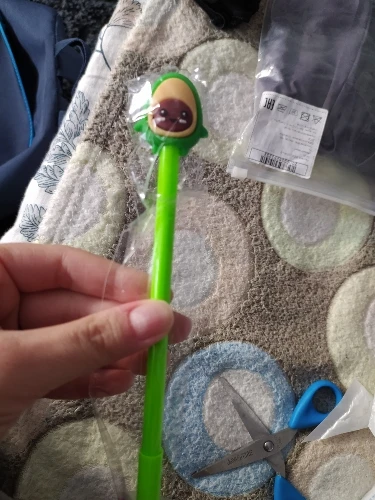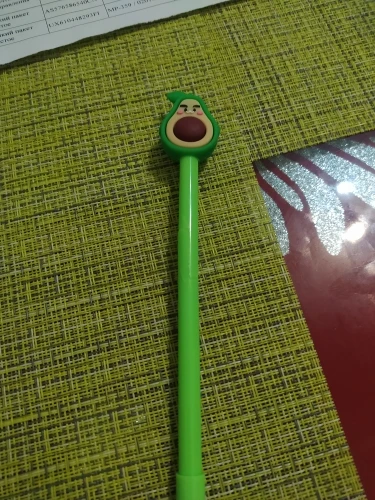 Товар пришёл в Псковскую область за 1,5 месяц. Авокадо можно снять если вдруг будет мешать. Длина ручки без авокадо 17 сантиметров, с авокадо 19. Чернила чёрные. Кончик ручки которым мы пишем очень тонкий. Ручка не заедает. Рекомендую